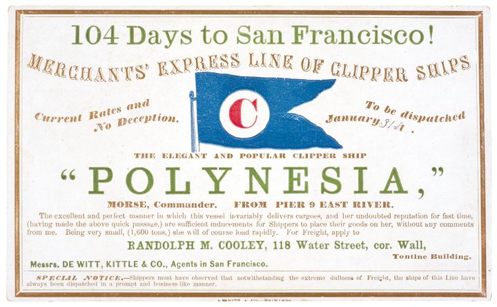 “104 Days to San Francisco! -- MERCHANTS EXPRESS LINE OF CLIPPER SHIPS -- Current Rates and No Deception. To be dispatched January 31st. THE ELEGANT AND POPULAR CLIPPER SHIP POLYNESIA, MORSE, Commander. FROM PIER 9 EAST RIVER. The excellent and perfect manner in which this vessel invariably delivers cargoes, and her undoubted reputation for fast time, (having made the above quick passage,) are sufficient inducements for Shippers to place their goods on her, without any comments from me. Being very small, (1600 tons,) she will of course load rapidly. For Freight apply to RANDOLPH M. COOLEY, 118 Water Street, cor. Wall, Tontine Building. Messrs. DE WITT, KITTLE &CO., Agents in San Francisco.”