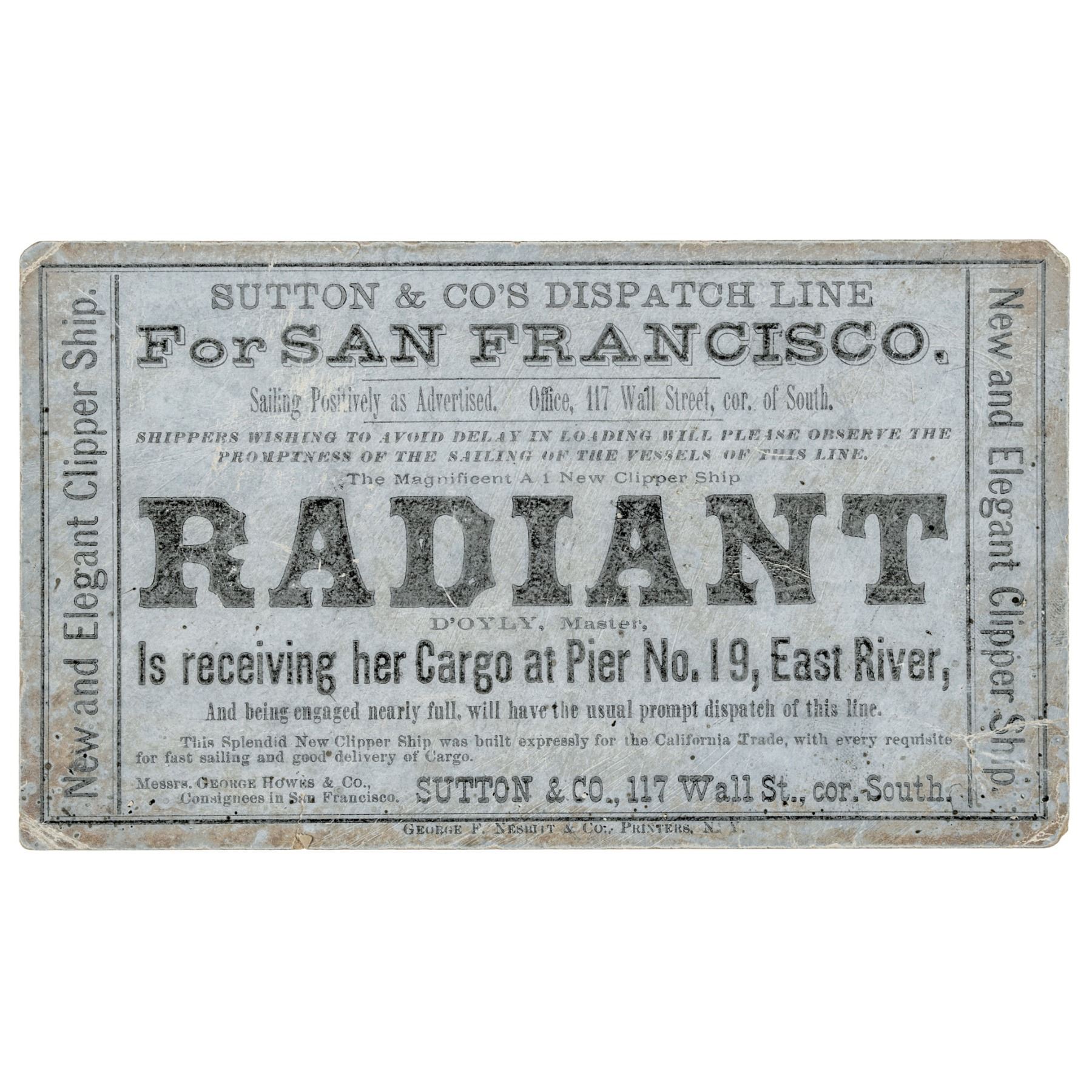 c. 1860 California Gold Rush Period, Printed Advertising Card, Promoting the Clipper Ship “Radiant” at New York, Very Fine.