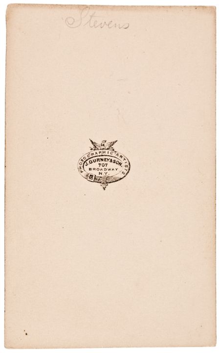 This original Carte de Visite Photograph shows a portrait of Alexander H. Stephens in chest-up pose, with maker’s back stamp, “PHOTOGRAPHIC ARTISTS J. GURNEY & SON, 707 BROADWAY, N.Y.” A very clean CDV with excellent contrast and tone to the image for display. Quite rare.
