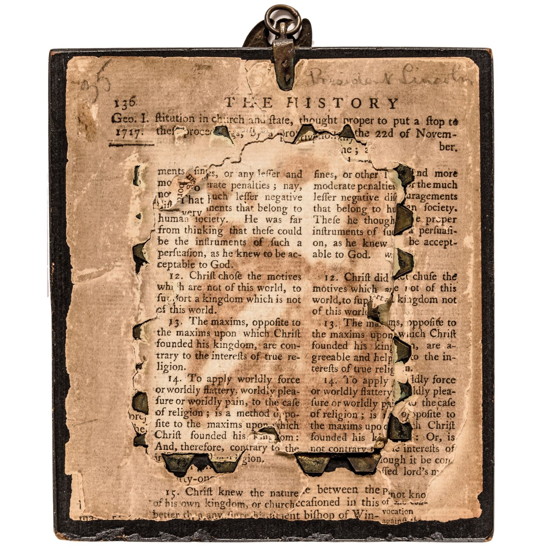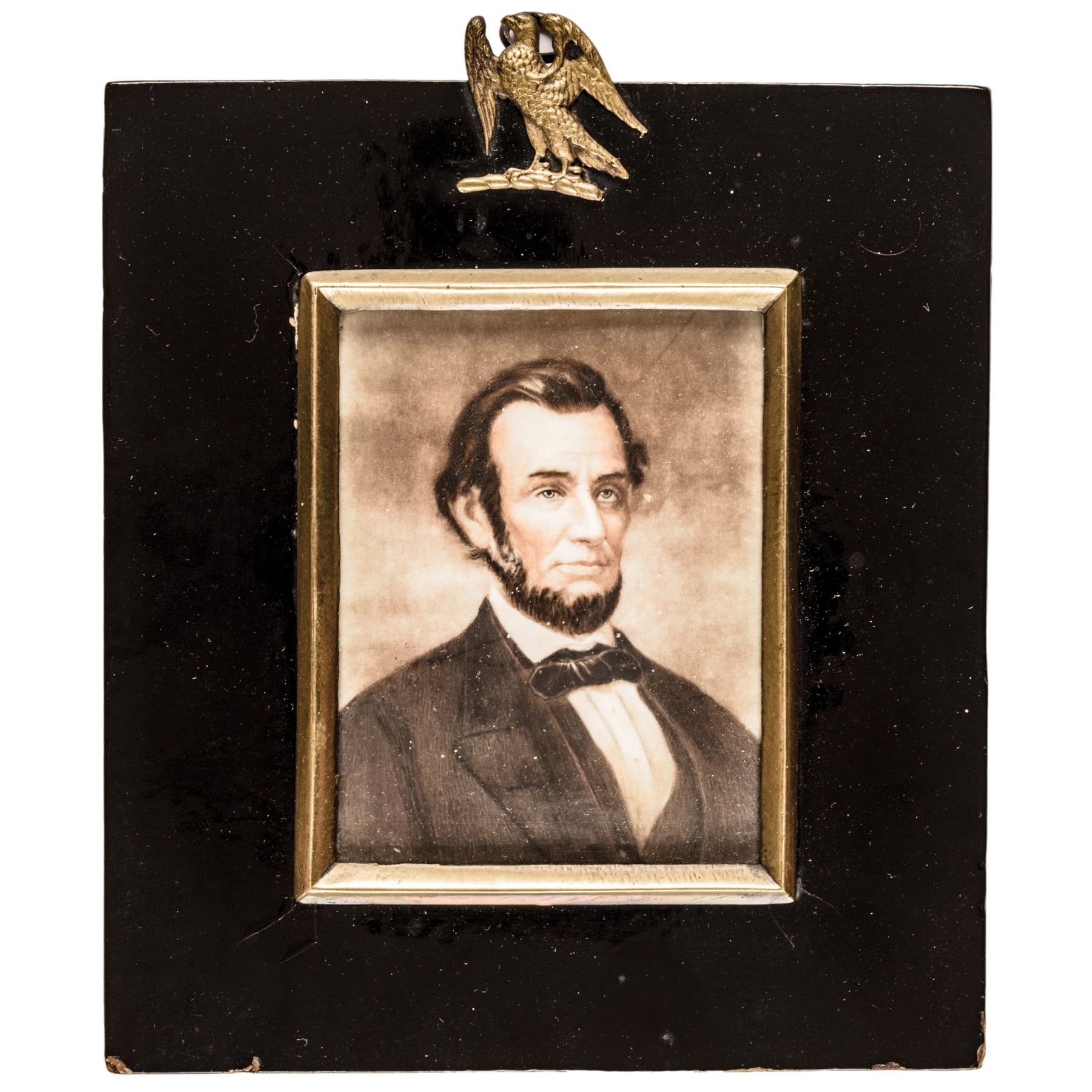 Beautiful museum quality Abraham Lincoln Miniature Portrait measuring 2.75” wide x 3.5” tall (by sight), painted on a white natural material housed within its original black lacquered wooden period frame, measuring fully to 5” x 5.5”. It depicts a bearded President Lincoln in a classic right-facing seated pose. This Hand-painted Watercolor is accomplished by a highly skilled artist, unknown, no date, exceptional in its detail and quality. The handsome portrait of President Abraham Lincoln shown in his black suit coat wearing a bowtie. A typeset printed page in English, apparently from an early bible, was used seal the back of the previously opened frame. A small gilt metal Heraldic American Eagle decoration is attached to the top center black lacquer painted frame with a brass loop for suspension attached at top. Some slight scuffing to the bottom frame corner. Overall a wonderful Lincoln miniature portrait with excellent eye appeal, ready for display.