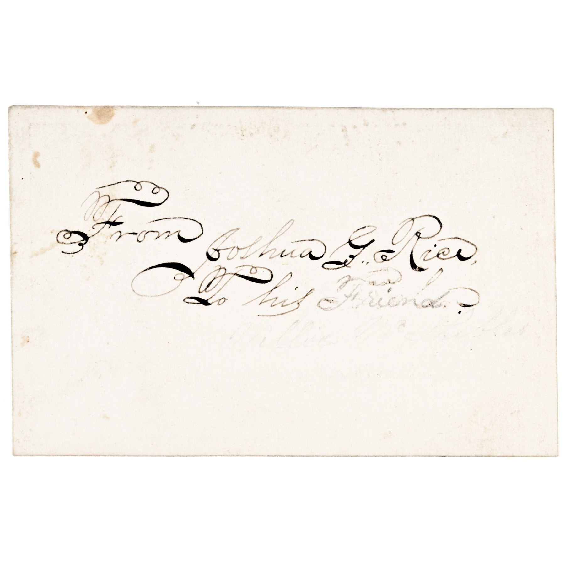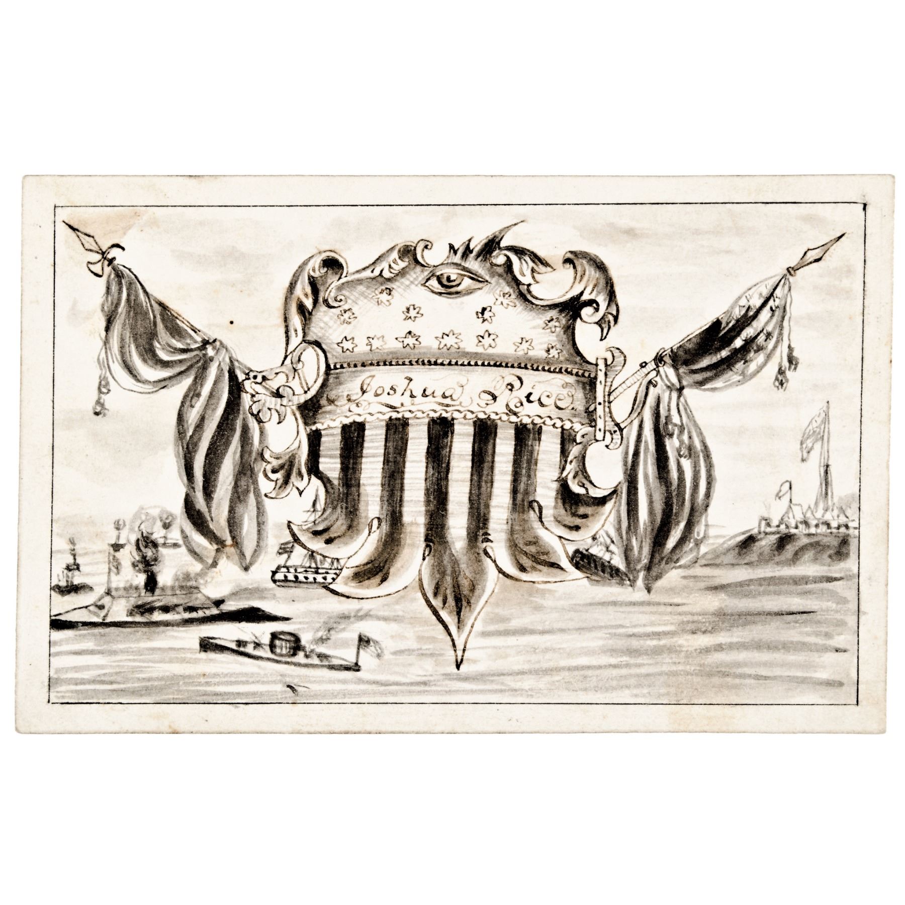 This original Hand-Drawn Civil War Period Pen-and-Ink depiction of the historic Battle between the “Monitor and Merrimack” also known as the “Battle of Hampton Roads” took place on March 9, 1862 in the American Civil War. This Hand-Drawn Illustrated Calling Card measures 2.5” x 3.75” and is from a Joshua Rice. Inscribed upon its blank back by Rice, “From Joshua G. Rice To His Friend.” This historic naval engagement commenced at Hampton Roads, Virginia, a harbor at the mouth of the James River. It is notable as history’s first duel between Ironclad Warships, and documented the beginning of a new era of naval warfare. Exquisitely executed and certainly unique. This Hand-drawn Pen-and-Ink also featuring a large Union Shield and bunting with the famous battle between the two Ironclads illustrated below. A significant period depiction of perhaps the most important and famous Civil War Naval history battle. A small yet notable item for display.