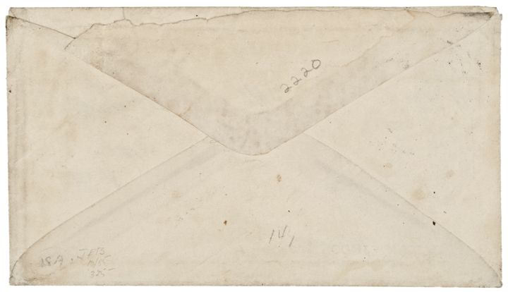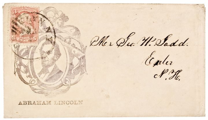 The ornate frame surround in a very rare violet print, with a central “Abraham Lincoln” portrait, tied to the Red 1861 3c Stamp (Scott-65), fully tied at the upper left upon this great cover to Exeter, N.H. by Brooklyn, N.Y. Circular Date Stamp, with a matching “square” grid (unusual). There is only minor edge wear from being mailed. Cataloged by Dr. James Milgram as AL-139 in “Abraham Lincoln Illustrated Envelopes and Letter Paper 1860-1865.” A stunning specimen that is Prohibitively Rare.