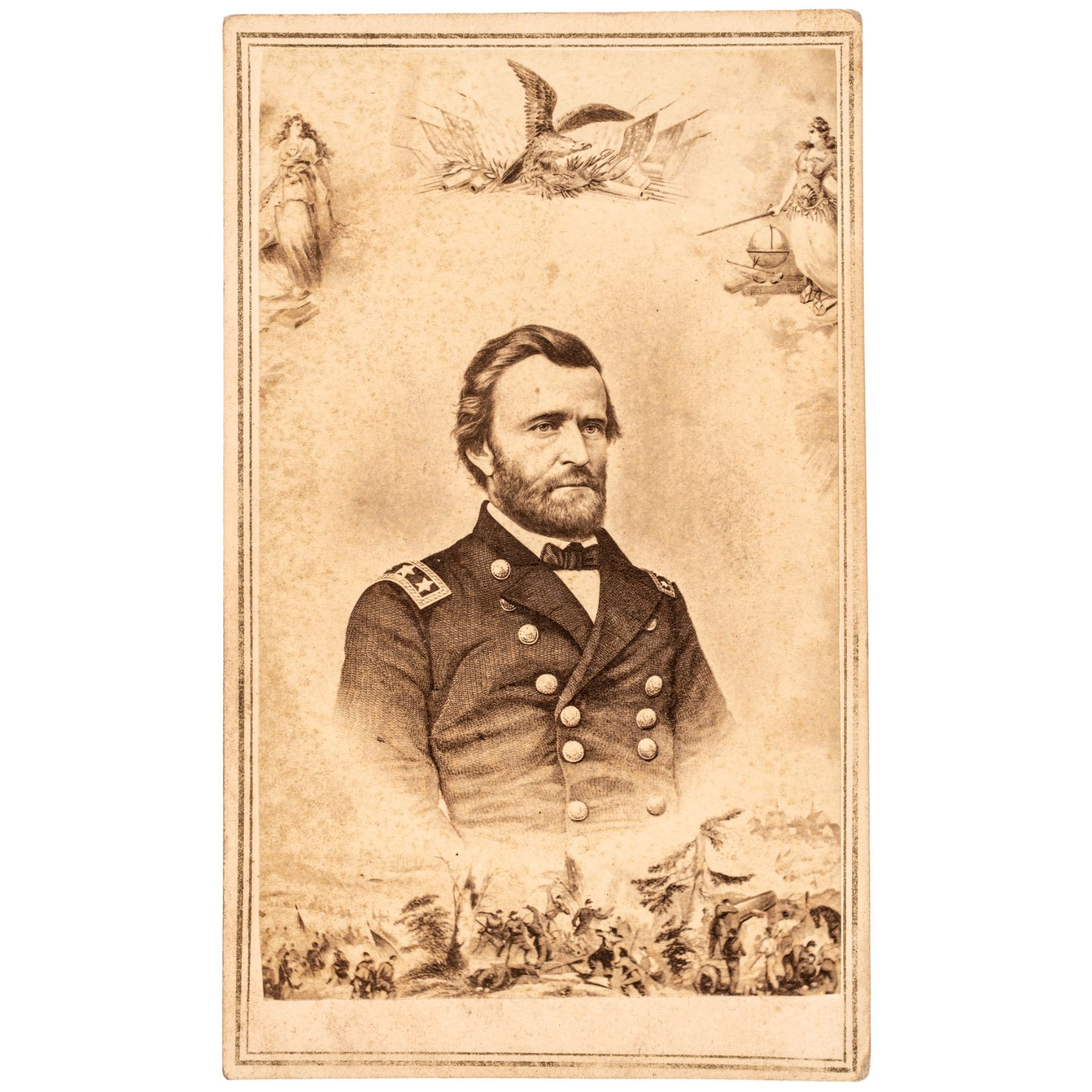 Scarce Patriotic Civil War Carte de Visite Photo of General Ulysses S. Grant with battle scenes, Miss Liberty and an American Eagle and Flags, Very Fine. Well centered photo on card from Lewis Powers, Books & Stationary, Main Street, Springfield MA., measuring 4" x 2-3/8".
