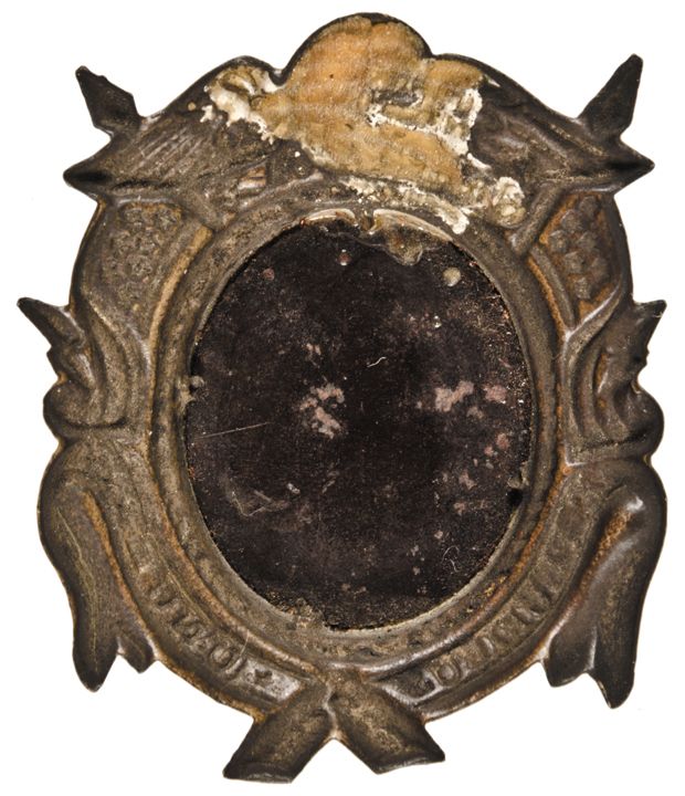 This exceedingly rare design Abraham Lincoln Tintype Photo is housed at center within this metal Patriotic Frame. The frame design measures 1” x 1.25” and shows an American Eagle with spear tips above its wings with other surrounding banners, flourishes and decorative design details. There is only slight wear and at bottom it reads, "PLURIBUS- UNUM" at either side. The Tintype Photo of Lincoln is in very good condition with the image even in deep tone, there is a tiny pin point dot near the 10 o'clock in the left field of the photo, well away from his portrait. Originally attached to ones lapel, it is lacking the pinback. This is the first of this impressive, extremely rare design we have offered.