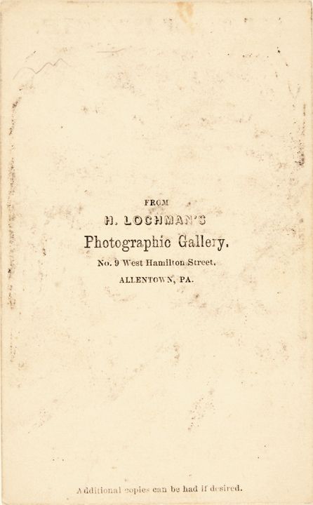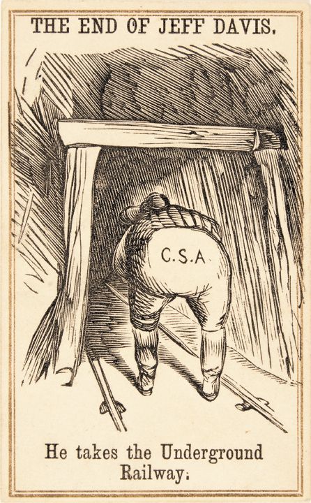 An original wood engraving shown on a standard 1860s double-line CDV mount, 2.5” x 4,” published by H. Lochman's Photographic Gallery, Allentown, Pennsylvania. Depicts Davis (viewed from behind) fleeing into a tunnel. Caption reads, "He takes the Underground Railway." The Underground Railroad was the metaphorically underground network of abolitionists who aided escaped slaves reach freedom in the North. Here, the ex-Confederate president is seen literally going underground! Very unusual.