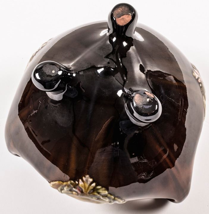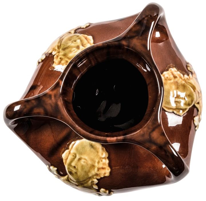 This attractive Tri-footed Redware Vase, measures 6” tall x 7.5” wide and is triple handled with Three contrasting raised yellow glazed Portraits of George Washington, each measuring about 3” tall and having no additional markings. Excellent in condition with an overall lustrous glaze.