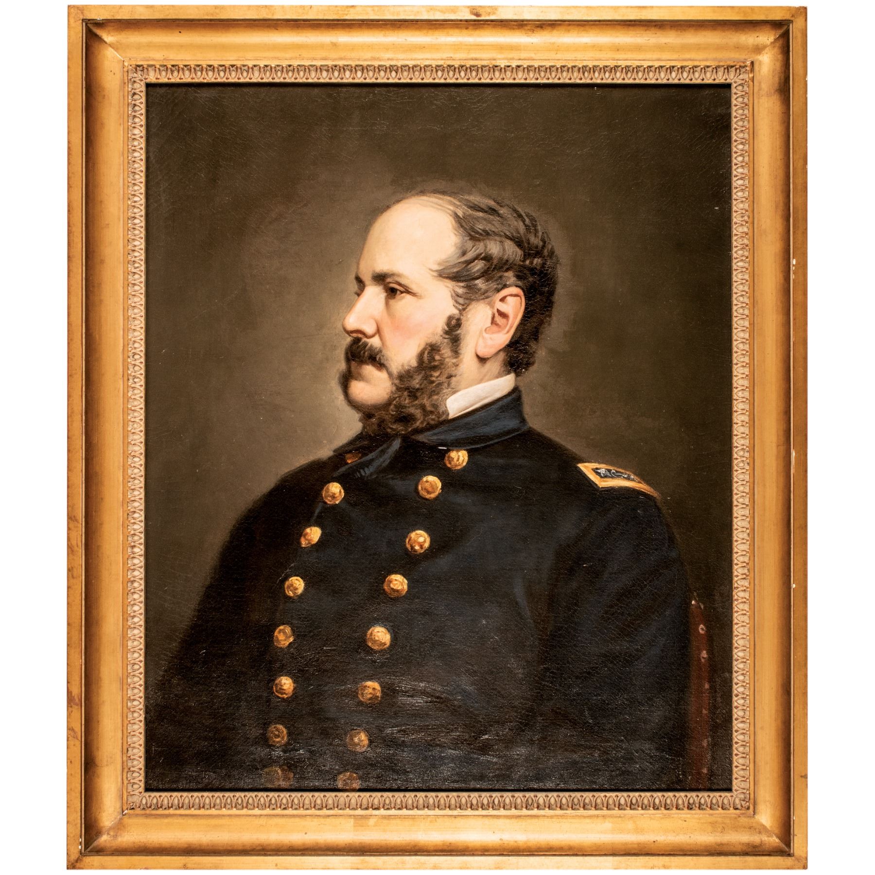 Exquisite Oil on Canvass Painting measuring about 24.5” x 29.5”, professionally ornately framed to 30.5” x 35.5”, its gold painted frame rim having some minor scattered edge nicks. Here, handsomely painted in his military uniform, Admiral Winslow is best known as the Commanding Officer of USS Kearsarge, the Union navy ship that sank the Confederate “Raider” CSS Alabama during the Civil War. Winslow was promoted to Rear Admiral in 1870 and Commanded the Pacific Squadron for two years before retiring. When he died in Boston in 1873, his coffin was draped with the American Naval Battle Flag of the Kearsarge. Two Ships in the U.S. Navy have been named “USS Winslow” in his honor: TB-5, a Torpedo Boat from the Spanish-American War, and DD-53, an O’Brien Class Destroyer that served during WW1.