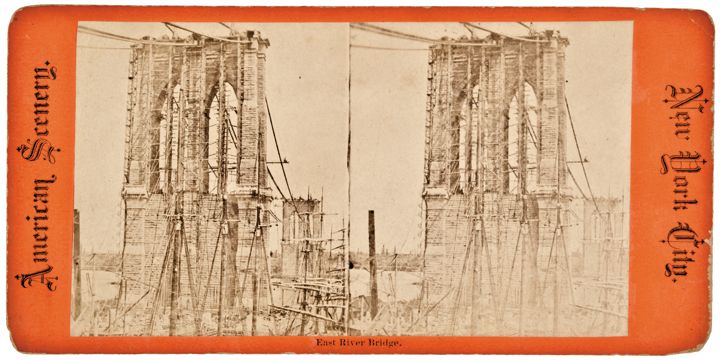 c. 1870 Stereoview Photograph View of the Building of the Brooklyn Bridge