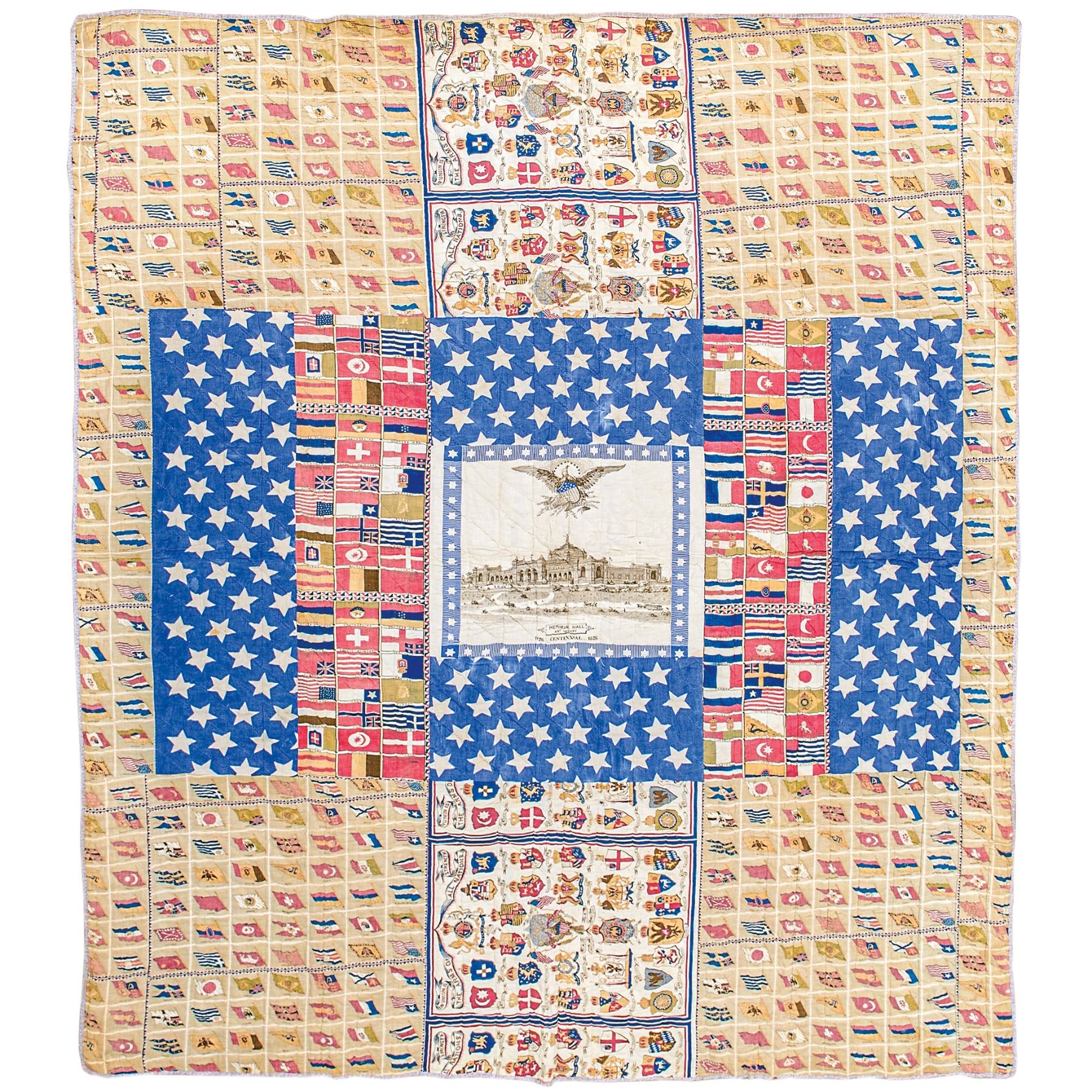 c. 1876 American Centennial, Flags of the World + Memorial Hall Decorated Quilt