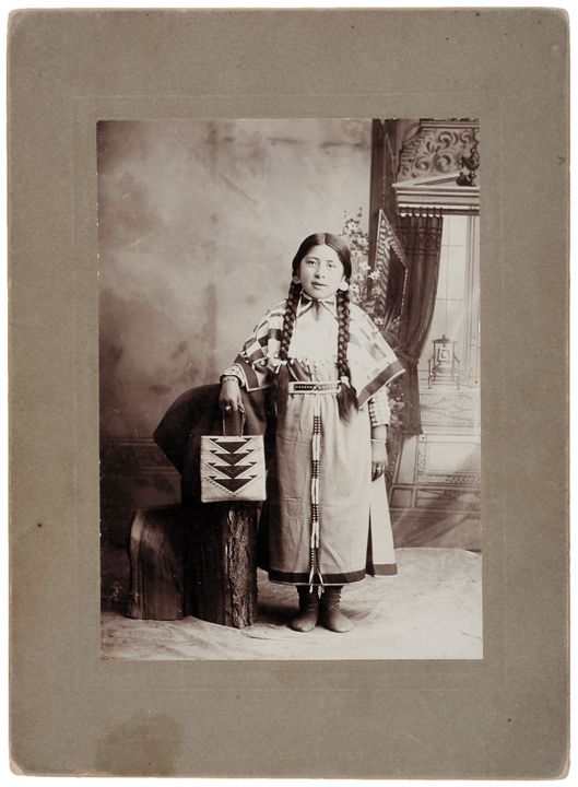 This wonderful 1880s Cabinet Card Photograph shows a young Native American Indian girl, possibly Hopi or Spokane, in her traditional dress, including a finely beaded belt and bag. The photograph is b/w, measures 4" x 5.5" and has no date or place. It has excellent contrast and sharpness, with just a slight tone spot at the bottom edge of the 8” x 5.75” cardboard mount. A truly beautiful image.