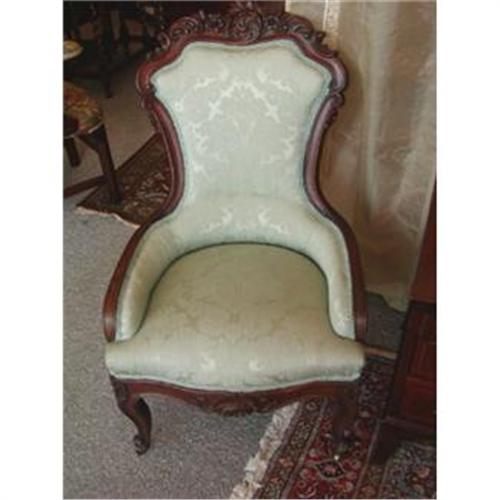 Beautiful hand carved Walnut Victorian Ladies' chair. Very good condition. Warm walnut color. Fabric is in very good condition, no rips/tears/stains. Beautiful aqua damask, very suttle. Height from the floor to the seat is 14". Sturdy and comfortable for such an old piece. Very appealing!!