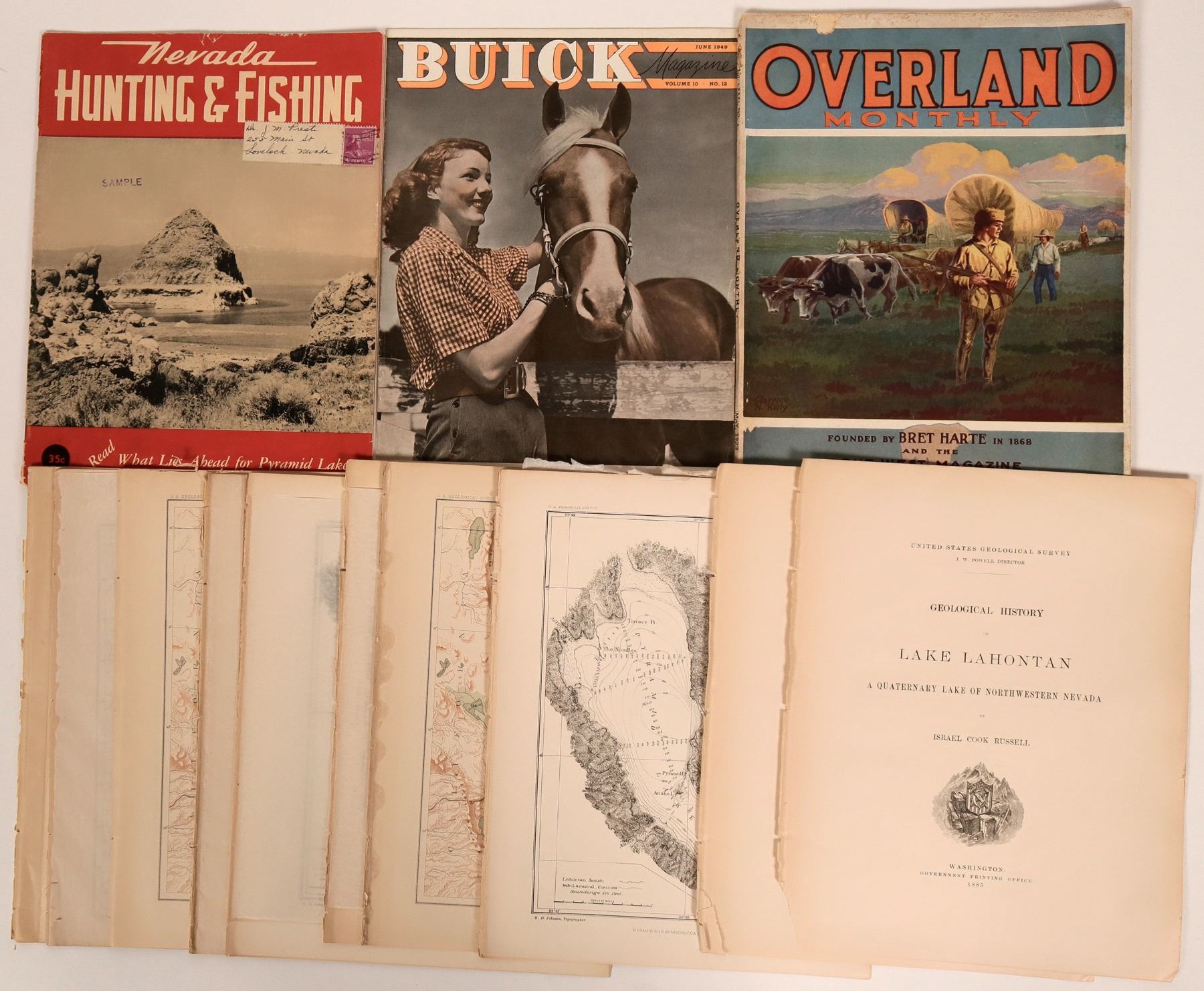 Lot of 4. 1) Disbound prints from the Russell 1885 USGS Geological History of Lake Lahontan, A Quaternary Lake of Northwestern Nevada. 13 different prints. 9.25 x 11.5" Toning. 2) Three magazines with articles about Pyramid Lake: Overland Monthly (May 1923); Nevada Hunting & Fishing (Jan. Feb 1949), and Buick Magazine (June 1949).