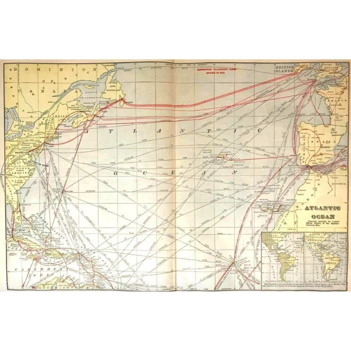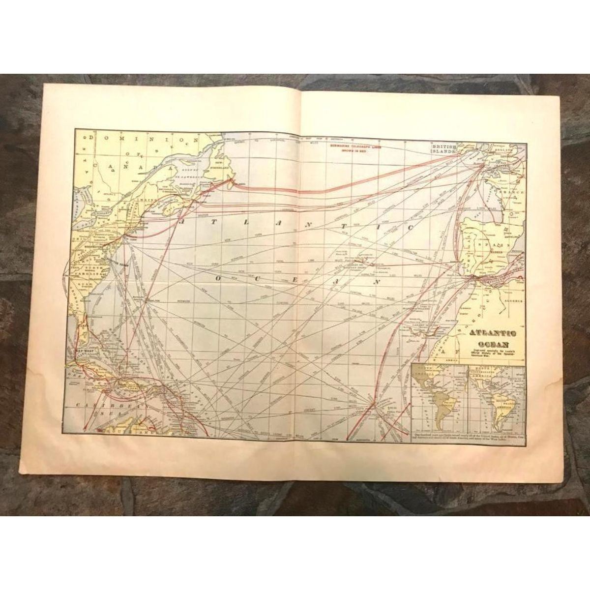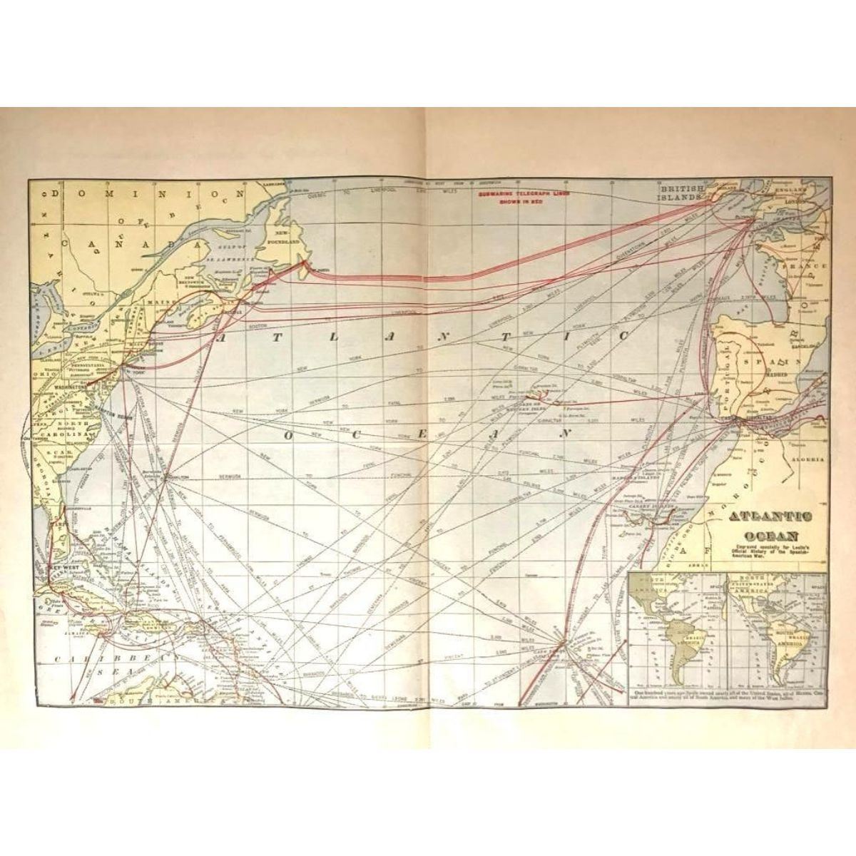 Original c.1890's map of The Atlantic Ocean, from an 1899 edition of Leslie's Official History of The Spanish American War. Map shows submarine telegraph lines, the eastern coast of The United States, Spain, the west coast of France, The British Islands & Newfoundland. 16 1/2" X 22".Â