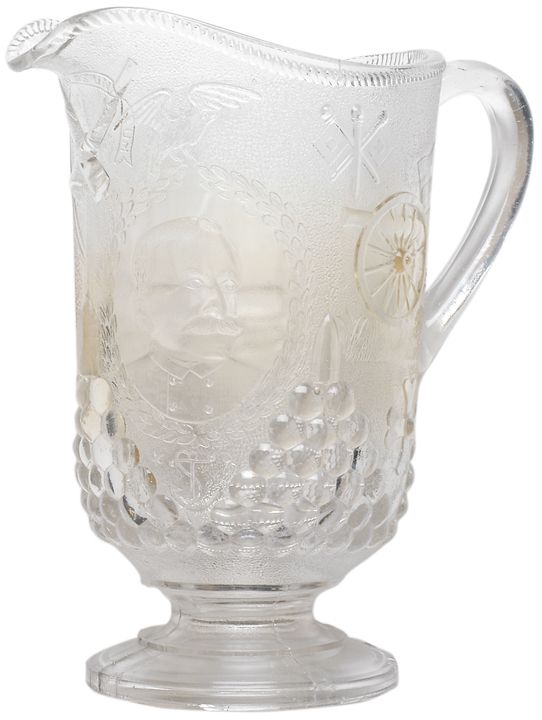 This handsome unmarked, clear molded glass pitcher measures 9” tall by 8” wide at its widest point, has a variety of raised images of Military Equipment, Flags, the Ship “Olympia,” and a portrait of Dewey. This pitcher is in superb condition, with almost no wear. There is a small chip and 2 small cracks in the foot, otherwise this piece is like new. With the U.S.S. Olympia as his flagship, Dewey attacked the Spanish fleet at Manila in the Philippines on May 1st, and within 6 hours had destroyed the Spanish fleet, forced the surrender of the commander, all without the loss of a ship or a single American casualty. A patriotic souvenir of a great American Naval Victory.