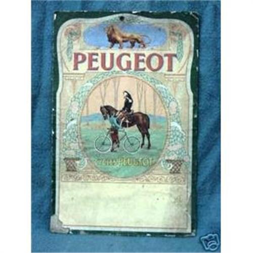 c.1900 Bicycles Cycles Peugot Cardboard Sign. 20" x 13". Light soiling & stain, corner creases & some mostly edge & corner paper loss. Also split thru the central image. Shipping cost will be the USPS estimate + insurance to be sent in invoice after purchase is made.