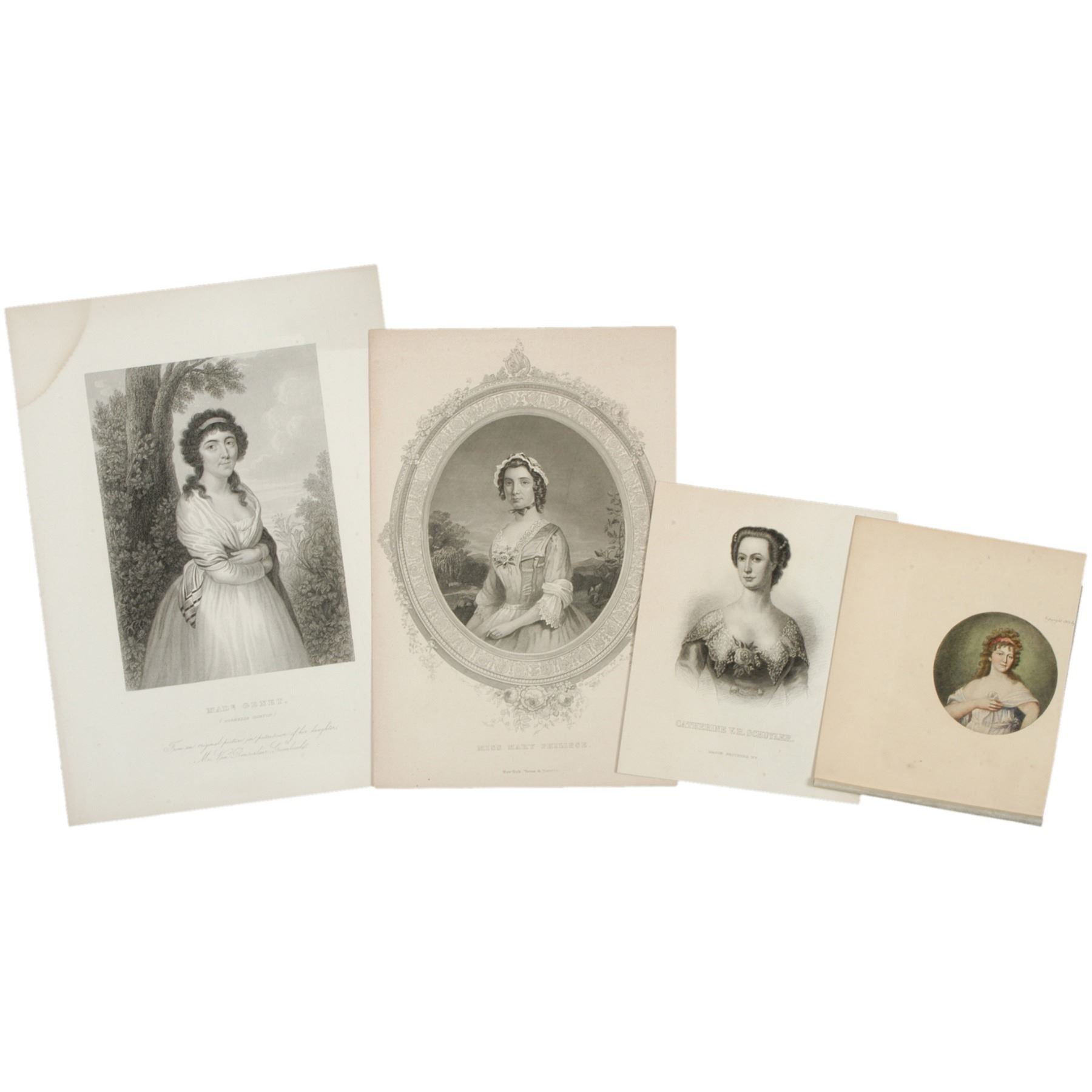 c. 1840-1904, Lot of 4 Portrait Prints of Famous American Women, Mrs. James Monroe, Catherine Schuyler, Madame Genet and Mary Philipse, Steel Engravings and Mezzotint Print, Extremely Fine.