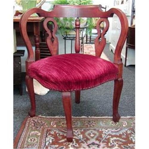 Very nice solid maple Empire Revival Corner chair. This piece has the original red velvet fabric, with decorative nails, which is in excellent condition, no stains/tears. The chair is very solid and quite heavy. This is a beautiful piece of furniture in very good condition, with no repairs. A great accent piece!