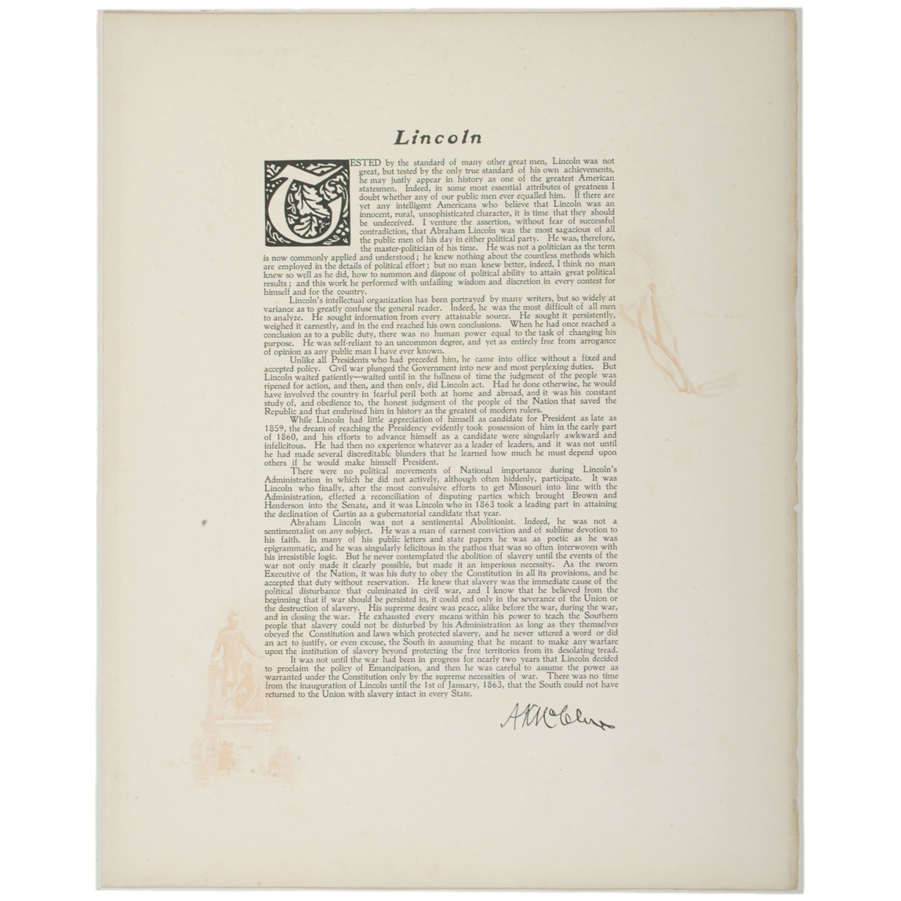 Large image size measures 11” x 8,” matted to an overall size of 20” x 16.” The back has a nice, typeset biography of Lincoln. A very impressive and desirable display piece.