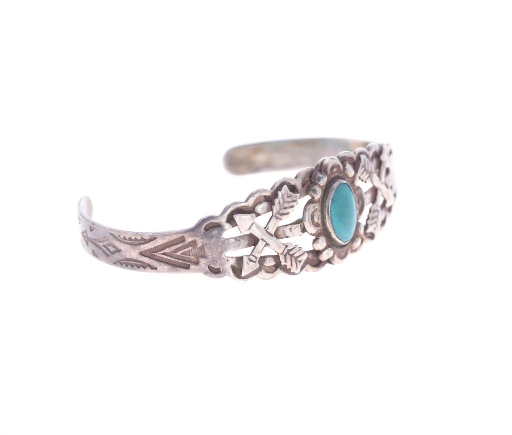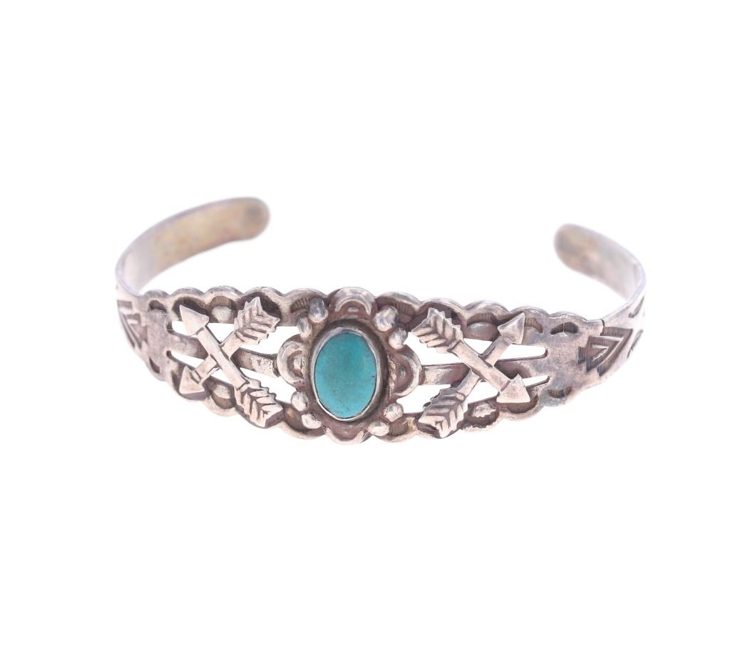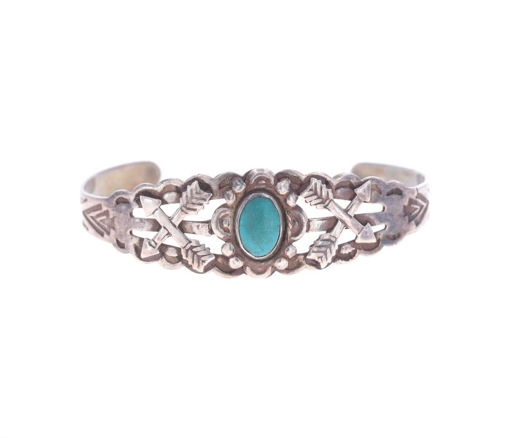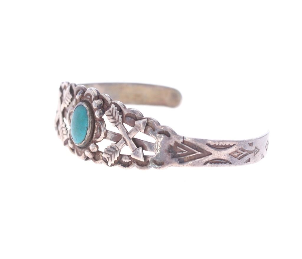 Featured in this lot is this Navajo Fred Harvey Sterling Silver and Turquoise Bracelet, circa 1910-1920's. The bracelet features a wonderfully and professionally crafted sterling silver construction that features stamping and tooling of cross arrows. The centerstone is a oval cut Stormy Mountain turquoise cabochon set into the bracelet face that shows a dark blue green luster. Fred Harvey era jewelry is generally a lightweight jewelry that was made for sale to the Anglo tourists along the Santa Fe railroad lines, in hotels and retail shops run primarily by the Fred Harvey Company. Fred Harvey era jewelry is widely collected and sought after as an antique jewelry genre valued for its Southwest look and historic context. It is easy to wear and generally has a fair amount of ornamentation and stamping. The condition of this bracelet is good with rich patina reflecting its age. Measures 6.5" circumference, 2.5"L x 2"H x .75"D, collective weight 15.8 gms.