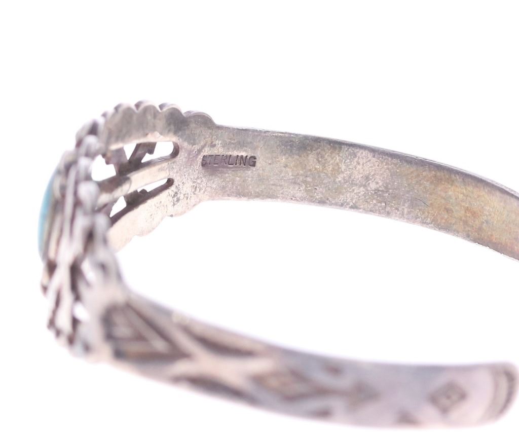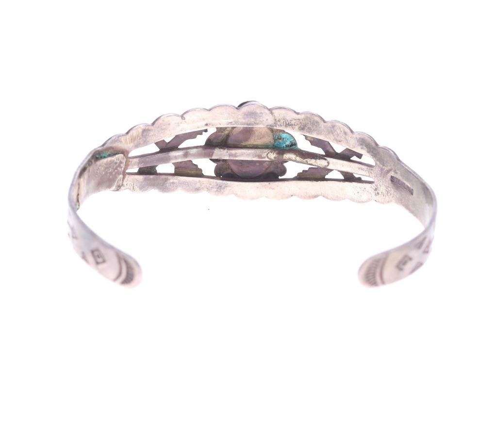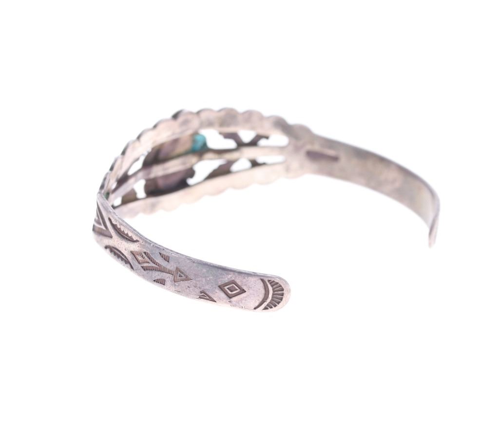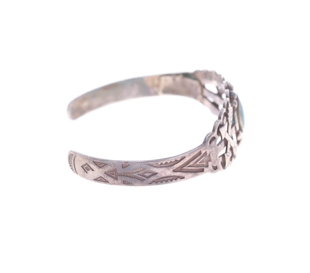 Featured in this lot is this Navajo Fred Harvey Sterling Silver and Turquoise Bracelet, circa 1910-1920's. The bracelet features a wonderfully and professionally crafted sterling silver construction that features stamping and tooling of cross arrows. The centerstone is a oval cut Stormy Mountain turquoise cabochon set into the bracelet face that shows a dark blue green luster. Fred Harvey era jewelry is generally a lightweight jewelry that was made for sale to the Anglo tourists along the Santa Fe railroad lines, in hotels and retail shops run primarily by the Fred Harvey Company. Fred Harvey era jewelry is widely collected and sought after as an antique jewelry genre valued for its Southwest look and historic context. It is easy to wear and generally has a fair amount of ornamentation and stamping. The condition of this bracelet is good with rich patina reflecting its age. Measures 6.5" circumference, 2.5"L x 2"H x .75"D, collective weight 15.8 gms.