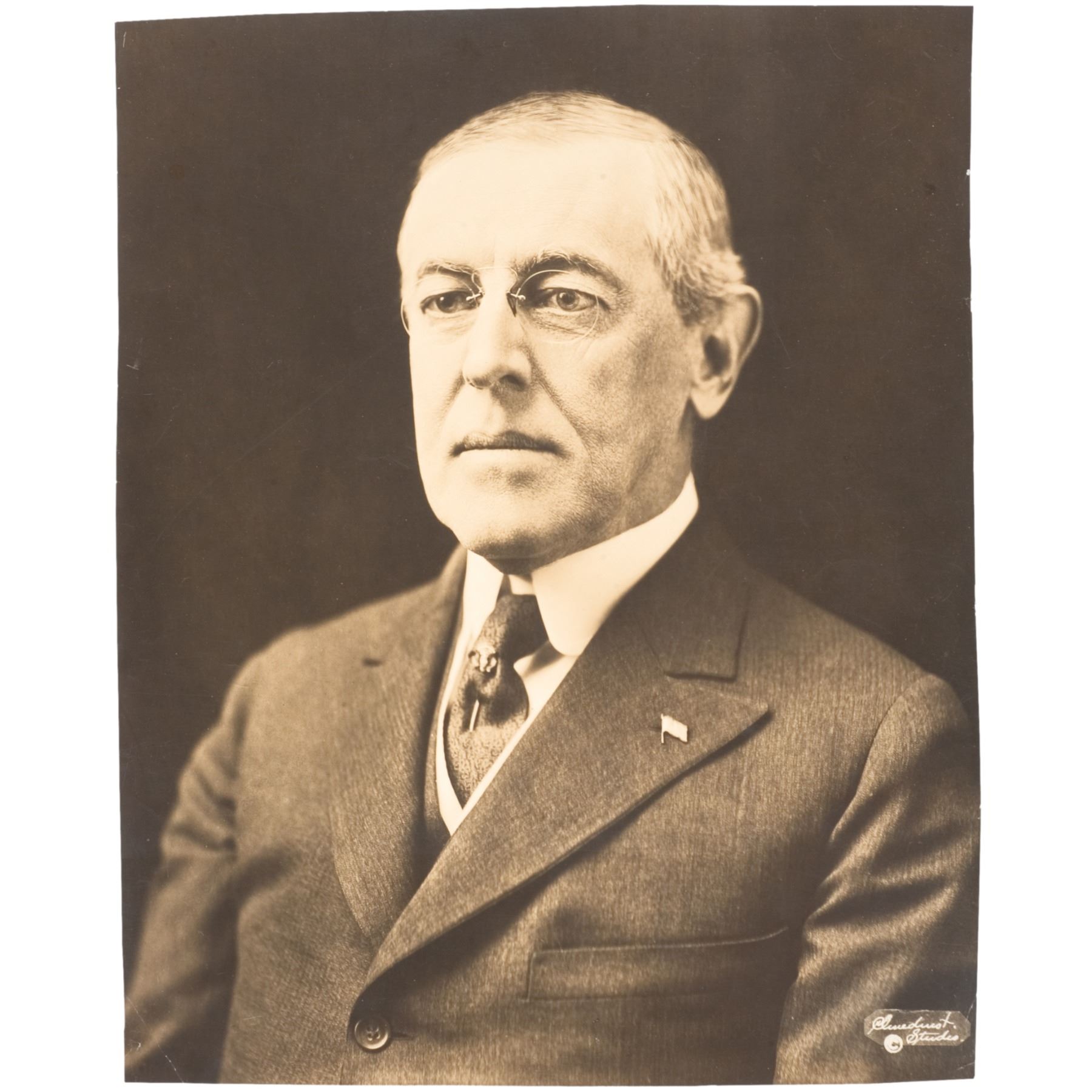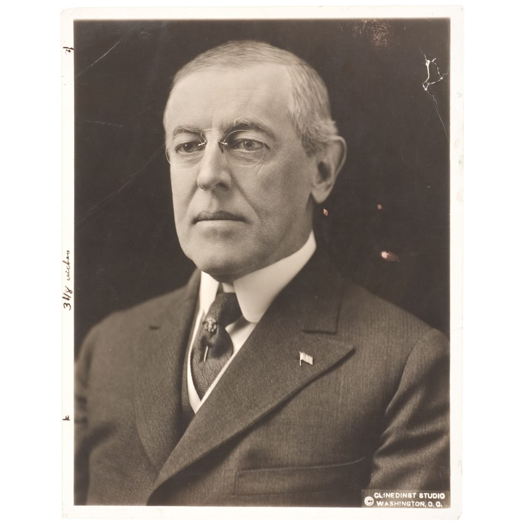 Two large Photos of President Woodrow Wilson, measuring 9” x 7” and 9.5” x 7.5,” both with copyright stamps on front and back by Clinedinst Studio. One photo with a small tear in upper right corner and some emulsion stains, and creases. (2 items)