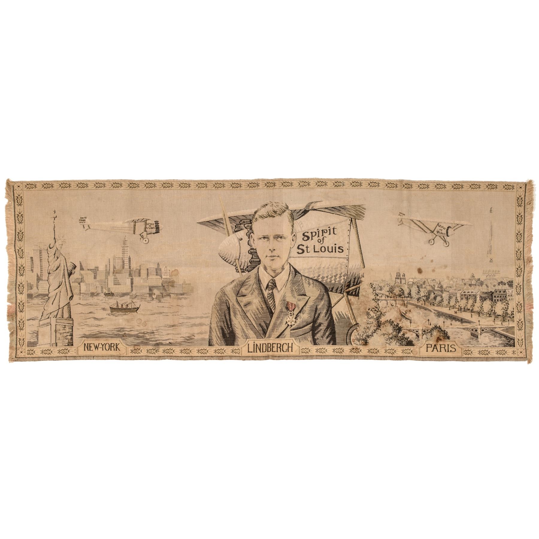 Charles Lindbergh Tapestry measures 18" x 54" with central Portrait titled “Lindbergh” shown framed against his airplane, plus two more full images of the “Spirit of St. Louis” as it leaves New York and as it approaches Paris. Skylines of both cities are incorporated. Thread colors in gold, blue, black, green, red, and pink have faded, but the overall image is still charming and attractive with a few minor brown spots, detracting little. A nice collectible Lindbergh item.