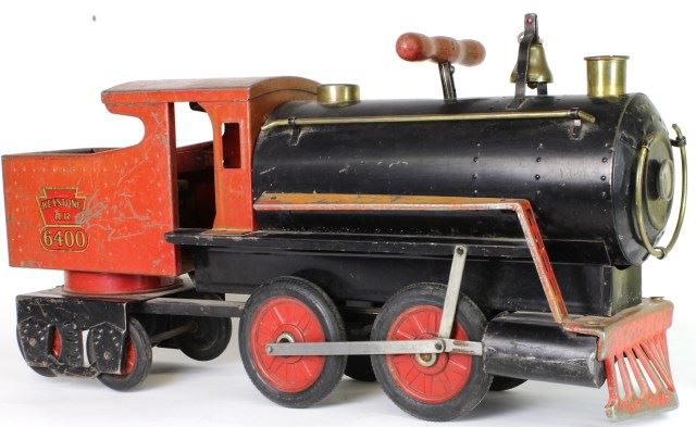ride-on, with steerable rear truck, battery operated lights and metal drive rods on the 4 1/2 rubber wheels. Short drive rod and piston is missing on left side, otherwise appears to be complete. Straight from the Frawley ranch house attic. Est. 250-450
