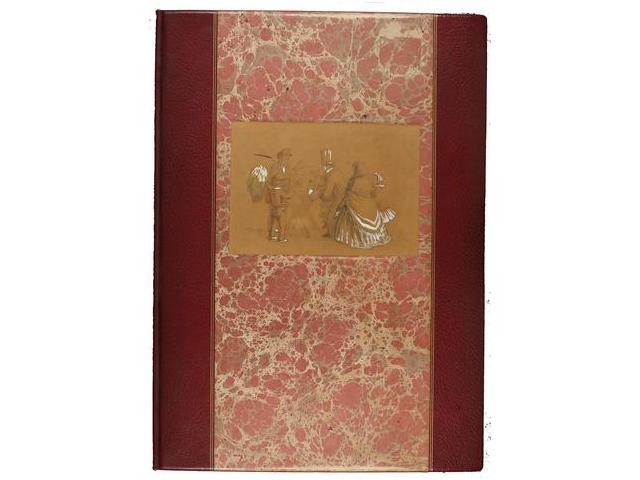 c. 1940., GRABADO: (ARTE-ENCUADERNACION),. ANGLADA, LOLA:, 16 LAMINES., Porfolio de 16 lám. pertenecientes a diferentes obras (Visions de la Barcelona Vuitcentista, Estampes de Catalunya), coloreadas a mano. La primera lleva una dedicatoria autógrafa de la artista. Presentado en una carpeta bellamente encuadernada en media piel, y una tira de piel también en el canto, con un dibujo original de Lola Anglada sobrepuesto en la cubierta anterior. Presentado todo dentro de una petaca.