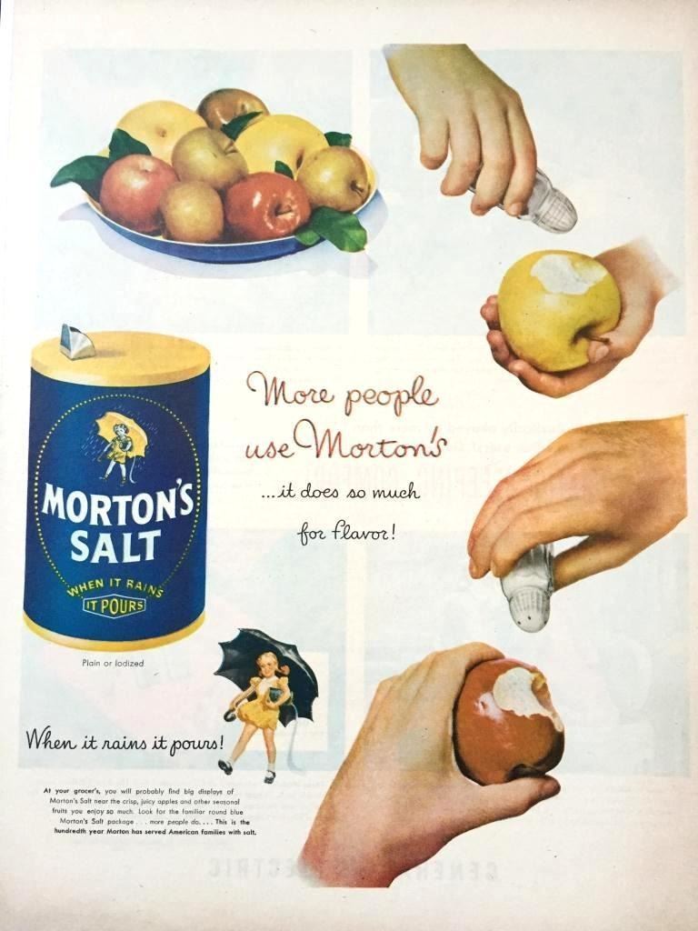 Original c.1950 mid-century magazine ad for Morton's Salt. Slogan reads, " More people use Morton's...it does so much for flavor!". Features fruit bowl & hands sprinkling salt over fruit. 10" X 14" mounted on archival linen cavas for preservation.