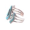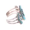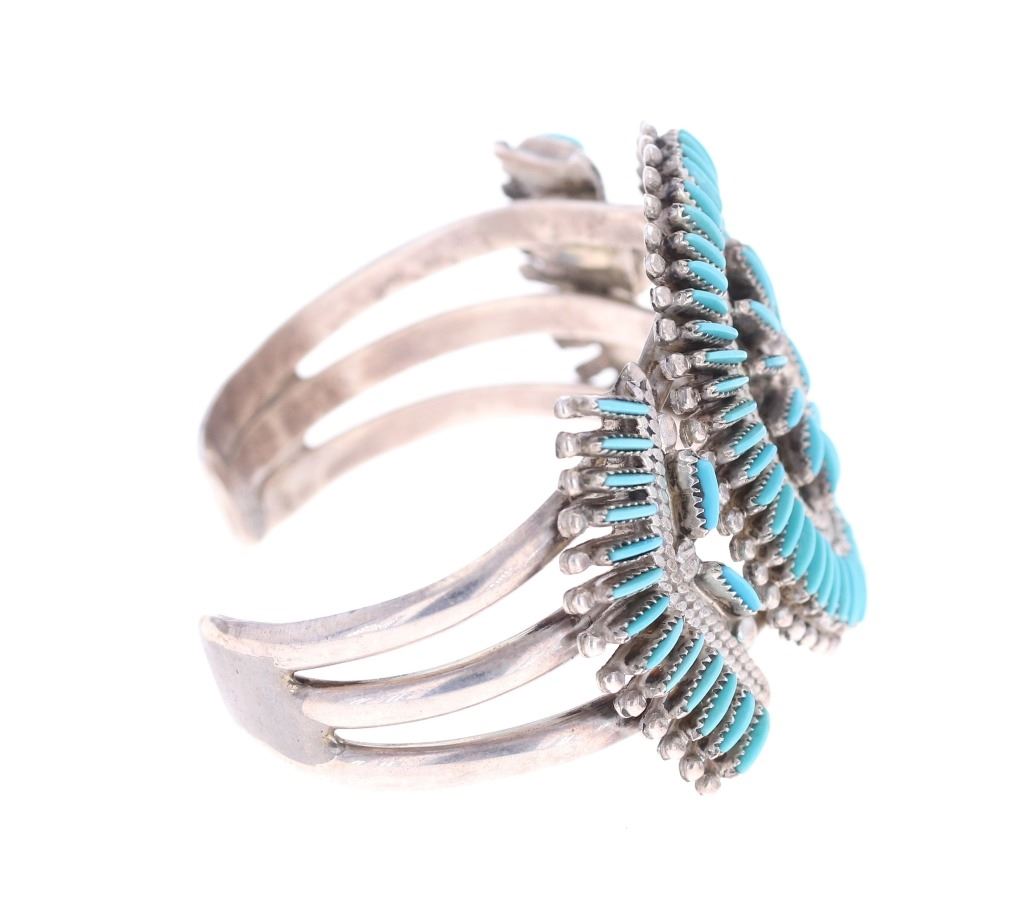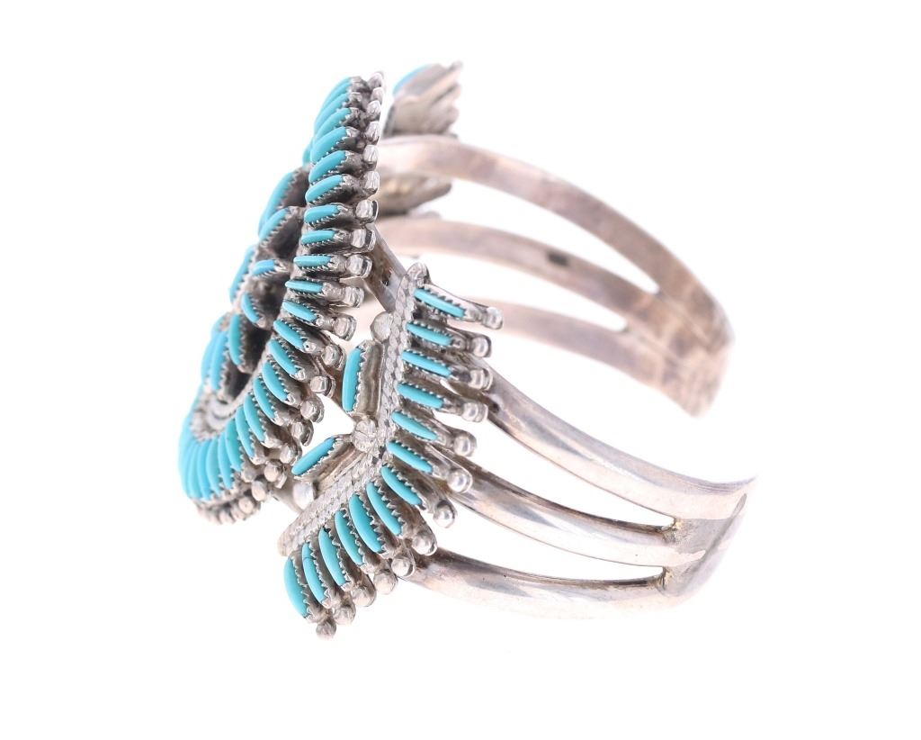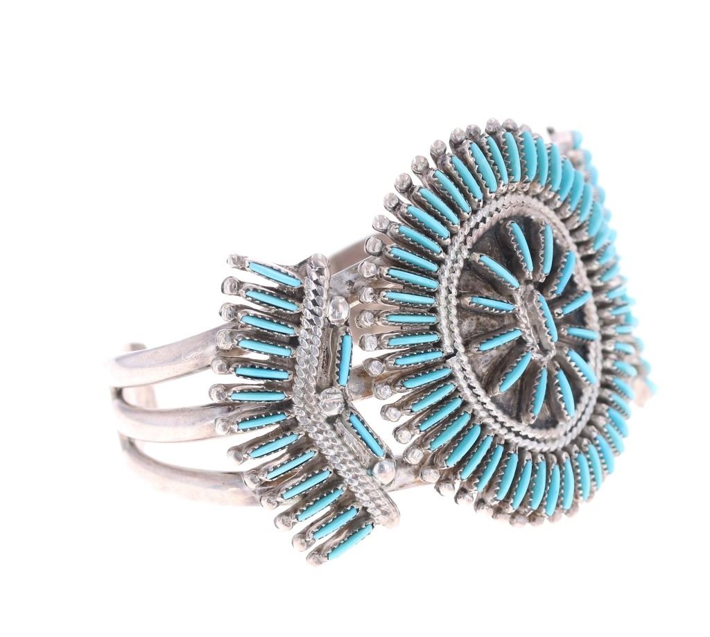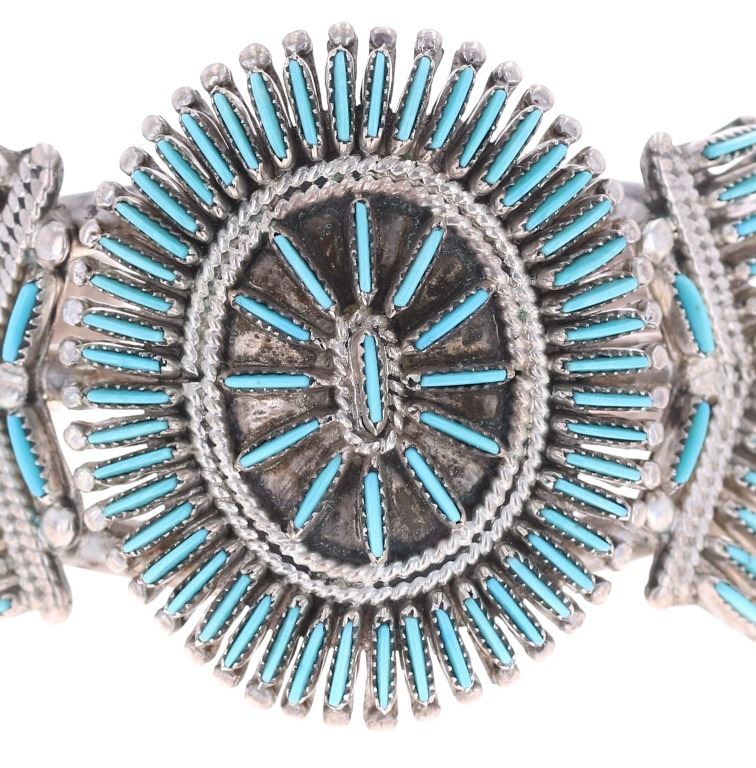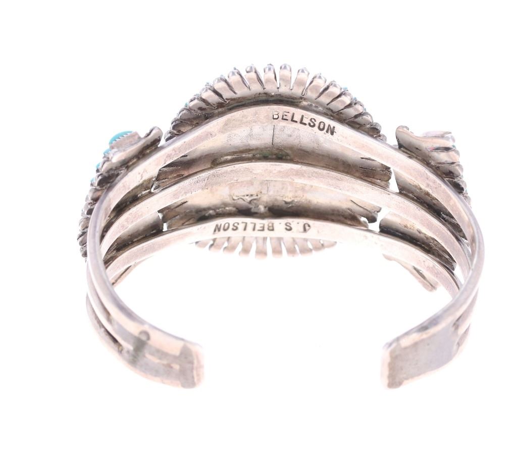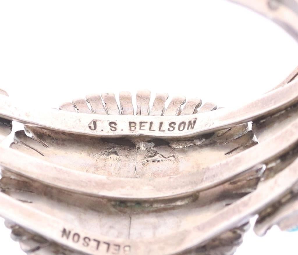 The lot features a fine circa 1960-1970s vintage fine needlepoint turquoise sterling silver bracelet by renowned Zuni artist, J.S. Bellson. J. Shirley Bellson has been noted as being one of the finest needlepoint turquoise artist with pieces dating back to the 1950s into circa 1980s. The bracelet has a heavy construction with thick triple sterling silver cuff band signed multiple ties, "J.S. BELLSON" and showing three heavy settings atop in sterling silver with a wonderful crown of sterling spots and framing of rope silver. The bracelet is set with fine needlepoint turquoise, also referred to as petit point, snake eyes, needlepoint and saw tooth. This is one of the finer Needlepoint and Bellson pieces, being finely kept and having a nice heavy weight. Overall, well kept with no missing or lose stones. Measures overall 1.75" x 2.5" x 2", inside circumference wrist size of 6.25". Total weight is 52.1 grams.*