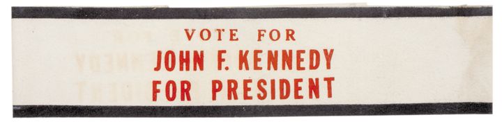 This original sash was meant to be worn over the shoulder and across the body in a parade type event. It measures 5” x 70” made of felt and designed to be worn across the torso. White cotton felt with navy blue trim and bold red block printing, “VOTE FOR JOHN F. KENNEDY FOR PRESIDENT.” Minor print transfer on face from storage and light blue felt marker inscription on verso, not seen from the front. A very rare piece of Kennedy memorabilia and a great looking item for display.