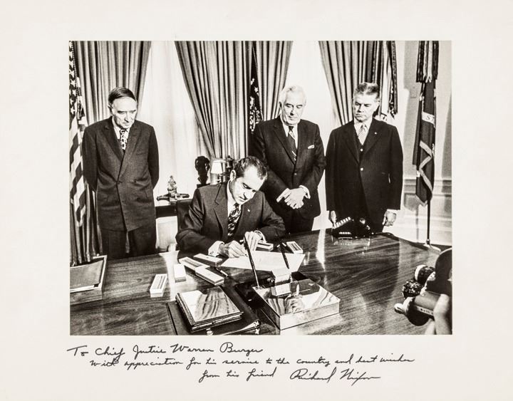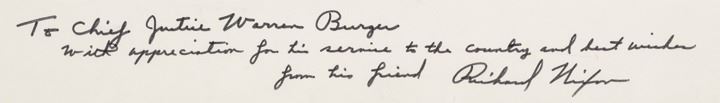 “To Chief Justice Warren Burger, with appreciation for his service to the country and best wishes from his friend Richard Nixon.”