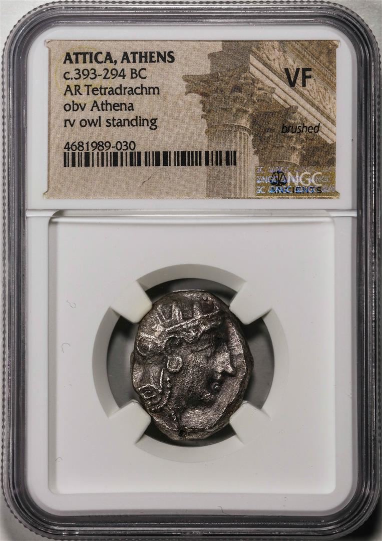 One c.393-294 BC Attica Athens AR Tetradrachm Athena Owl Ancient Coin NGC VF. NGC Certified.