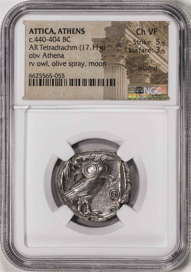 One c.440-404 BC Attica Athens AR Tetradrachm Athena Owl Ancient Coin NGC Ch VF. NGC Certified.
