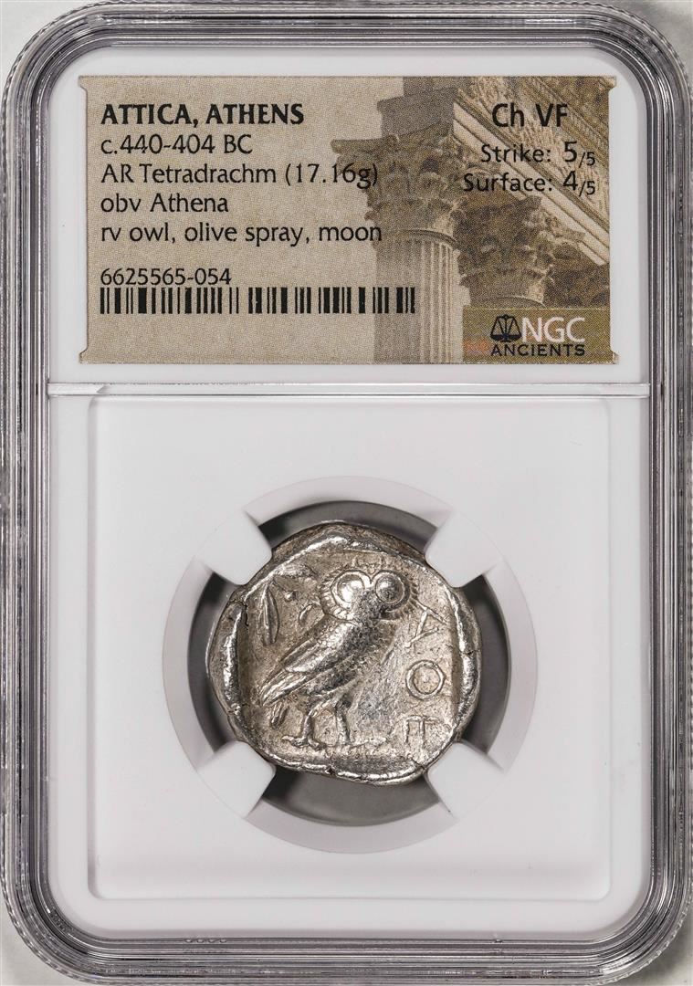 One c.440-404 BC Attica Athens AR Tetradrachm Athena Owl Ancient Coin NGC Ch VF. NGC Certified.