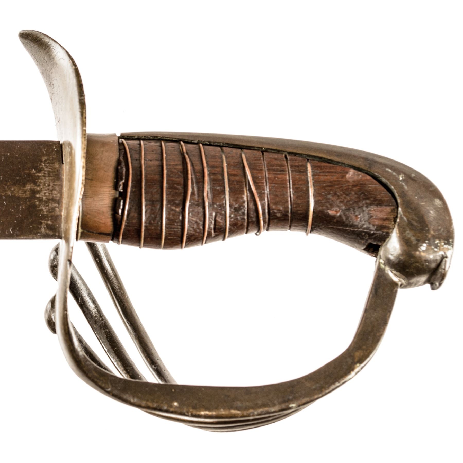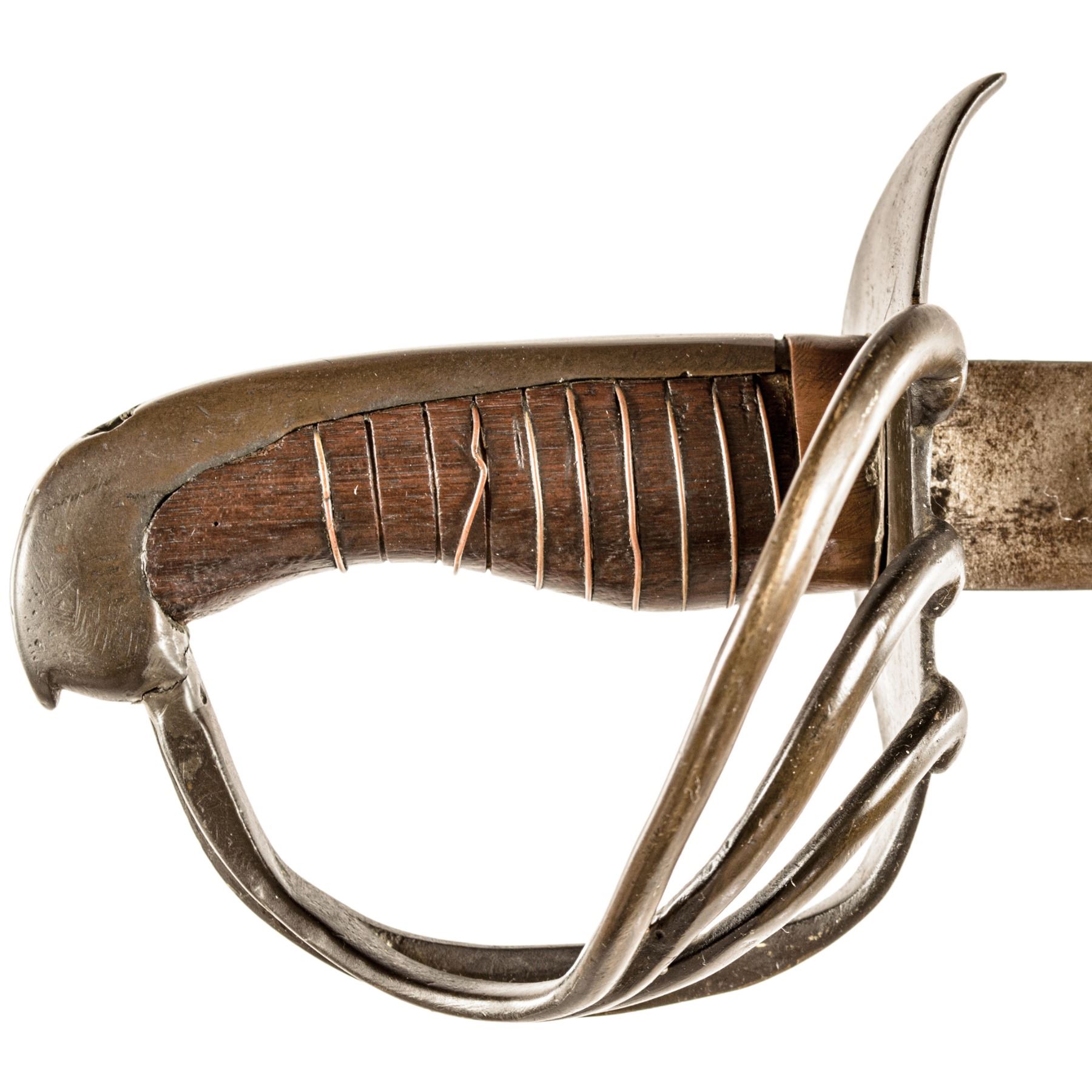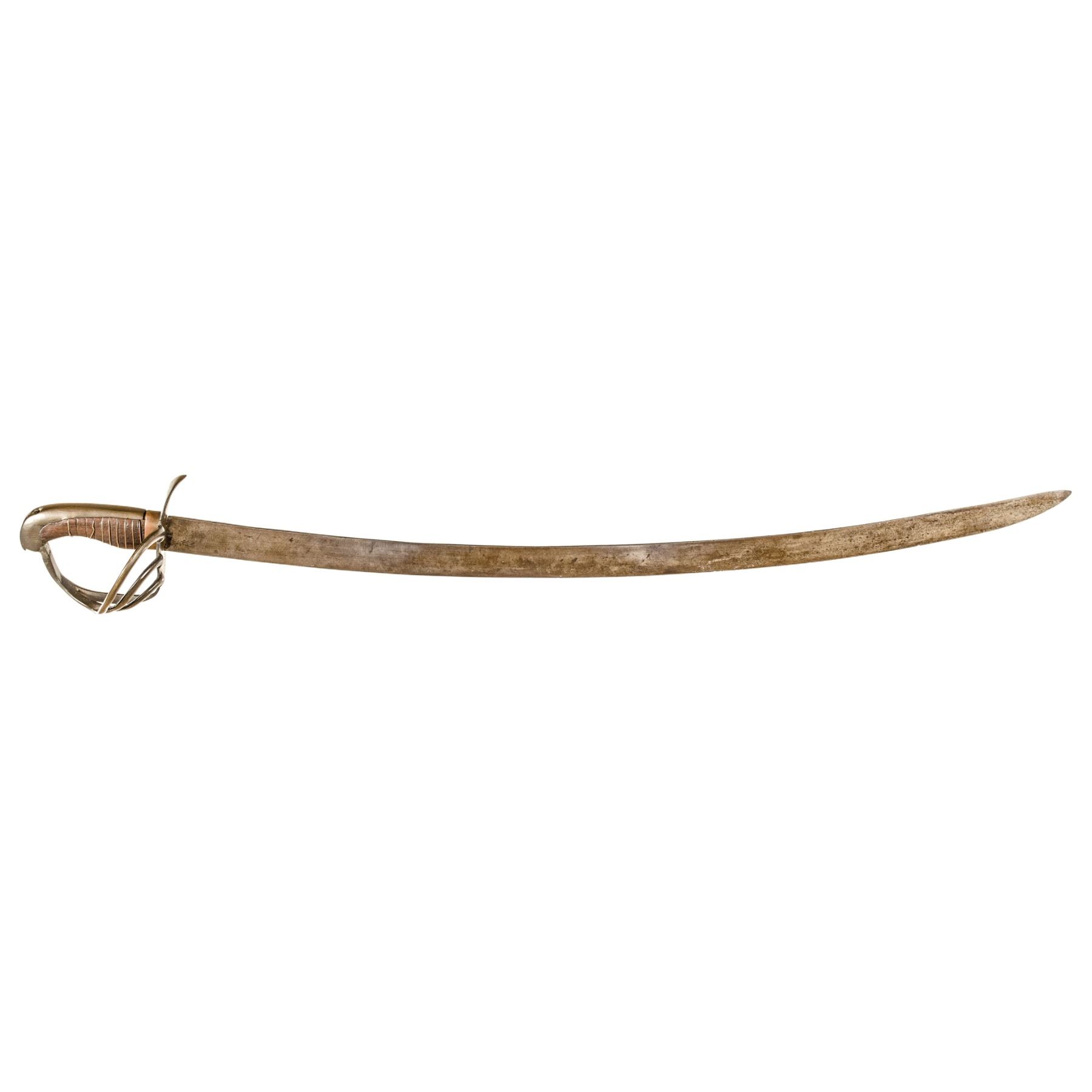 This Unidentified Heavy Cavalry Sword has a 33.5" single-edge, unmarked curved blade. The brass hilt / guard is a similar form to the French Military AN XIII Curassier's Broadsword. Wood grip has single brass wire wrap (some loses). The sword is most likely an assemblage of parts to make a serviceable weapon that may have seen action in the Napoleonic War through the American Civil War. It is very possible that this sword was used by a Confederate cavalryman. The scabbard is lacking. This sword came out of an old collection that had a large focus on the Civil War (especially Confederate weapons). The blade has areas of light salt and pepper rust pitting, overall a dull grey in color. The brass hilt / guard has a deep olive green age patina.