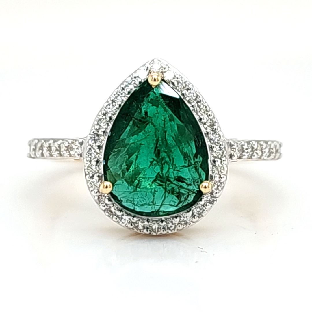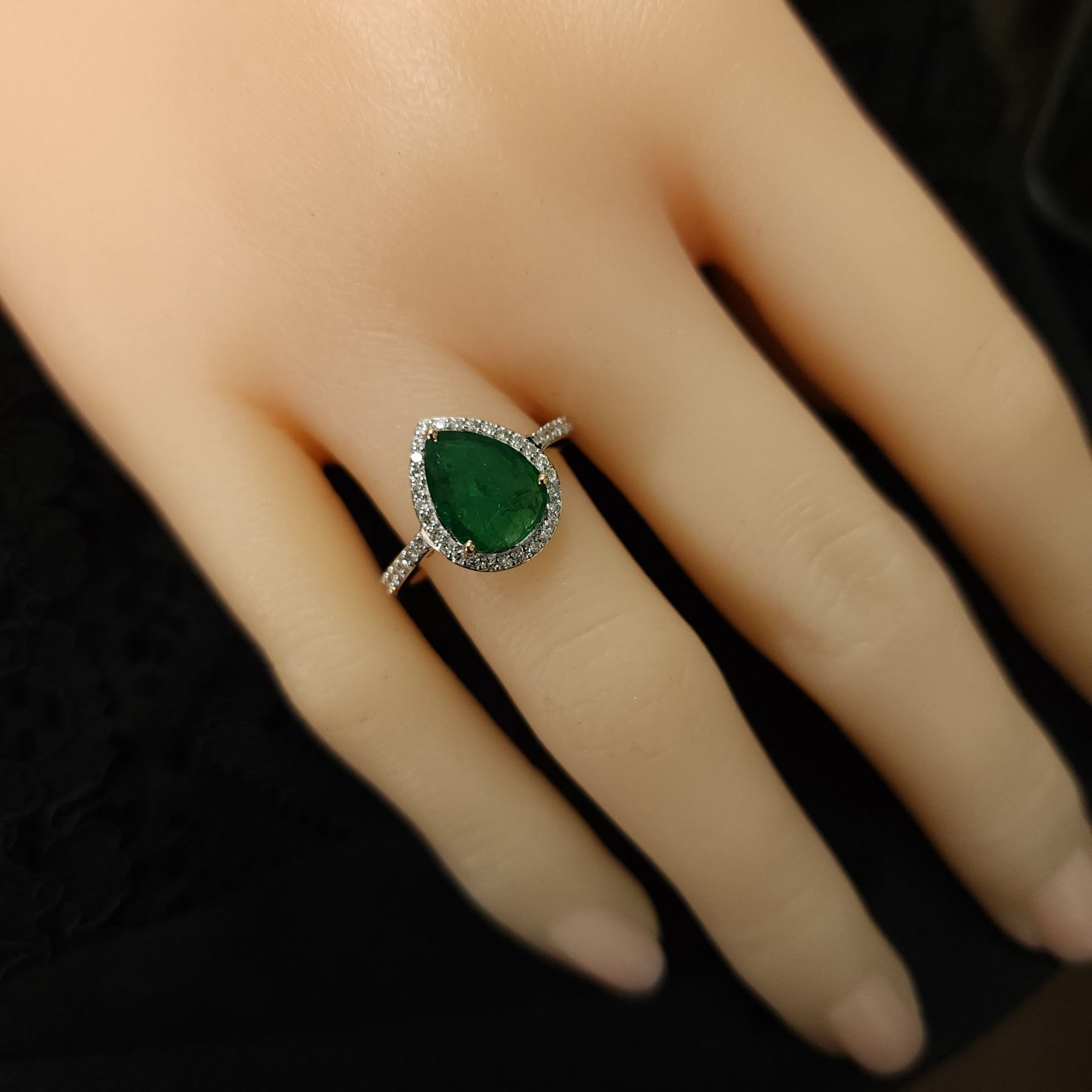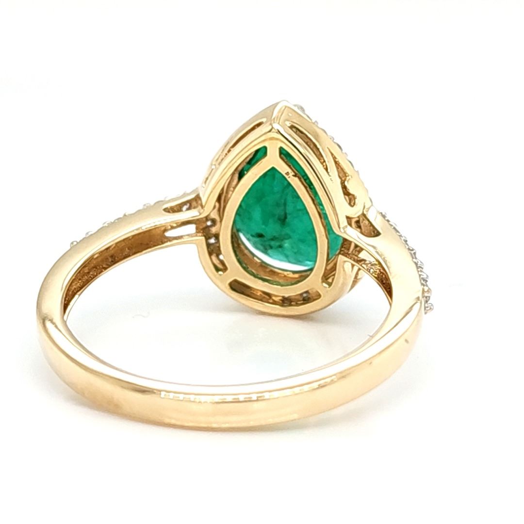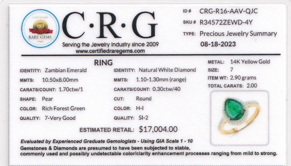 Genuine Emerald and Earth-Mined Diamond Ring.& nbsp; No wonder Zambian emeralds have been in the spotlight lately.& nbsp; Look at the depth of color on this ring, amazing!& nbsp; This 14 karat yellow gold ring features a 1.70 carat prong-set, pear-shaped Zambian emerald with .30 carats of round, brilliant-cut, H-I color, SI2 clarity diamonds in the halo and shoulders.& nbsp; The ring is US size 7 and has an approximate 2.2 mm shank and supporting gallery.& nbsp; This ring can be resized for an additional $100, please allow an additional 10 days for shipping if we resize it.& nbsp; This ring is certified and appraised for $17,004.00 estimated retail replacement value.& nbsp;& nbsp;