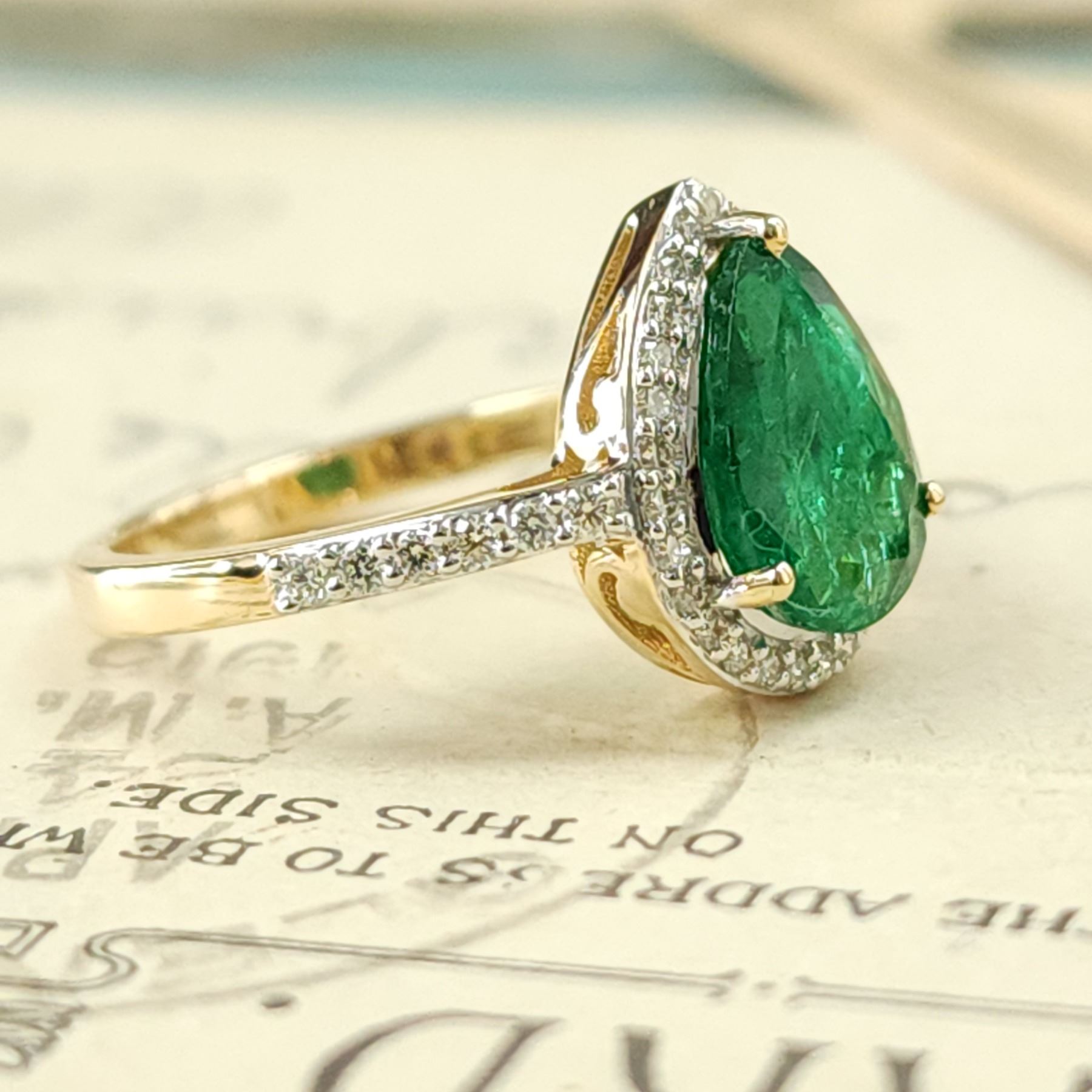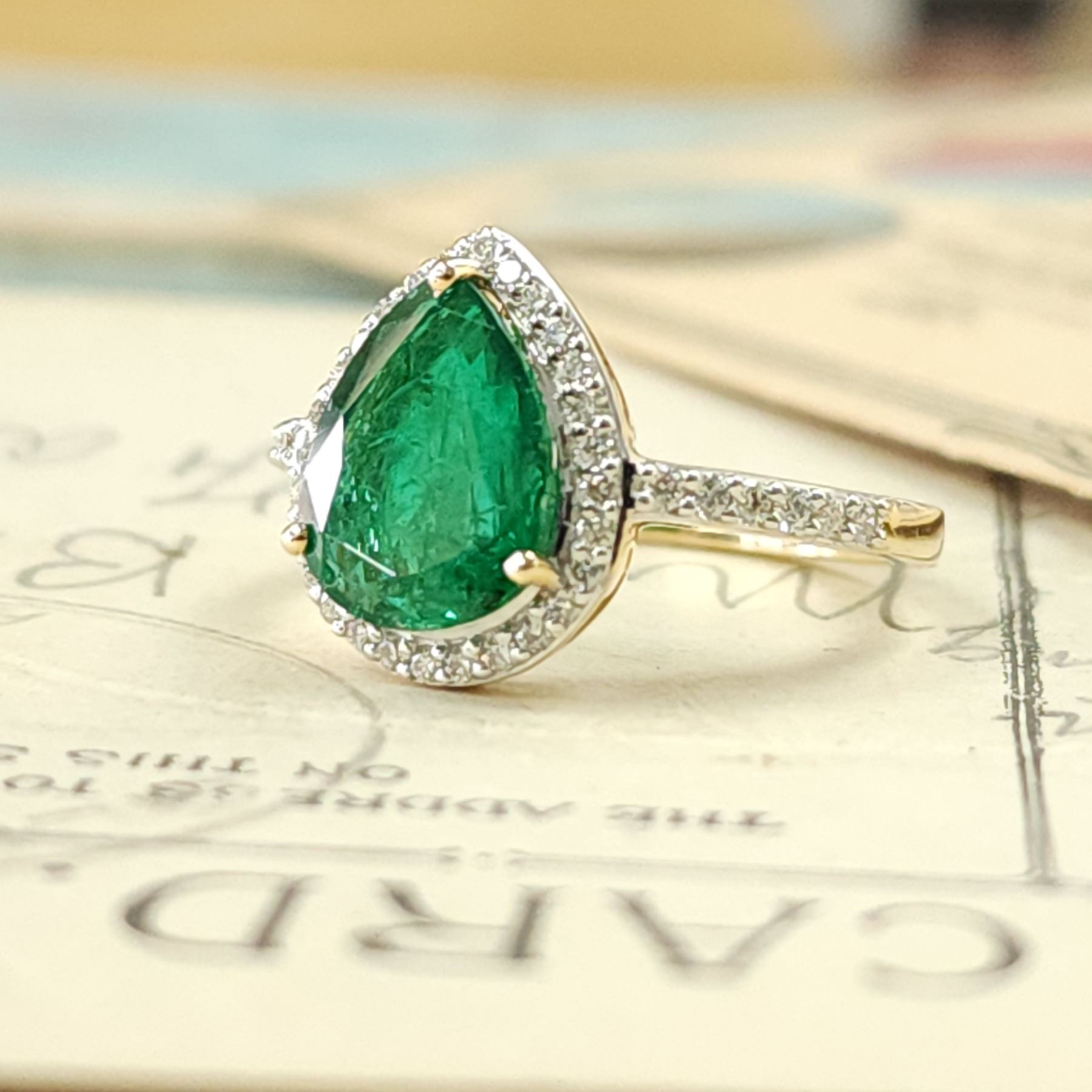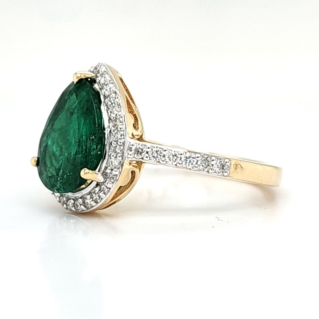 Genuine Emerald and Earth-Mined Diamond Ring.& nbsp; No wonder Zambian emeralds have been in the spotlight lately.& nbsp; Look at the depth of color on this ring, amazing!& nbsp; This 14 karat yellow gold ring features a 1.70 carat prong-set, pear-shaped Zambian emerald with .30 carats of round, brilliant-cut, H-I color, SI2 clarity diamonds in the halo and shoulders.& nbsp; The ring is US size 7 and has an approximate 2.2 mm shank and supporting gallery.& nbsp; This ring can be resized for an additional $100, please allow an additional 10 days for shipping if we resize it.& nbsp; This ring is certified and appraised for $17,004.00 estimated retail replacement value.& nbsp;& nbsp;