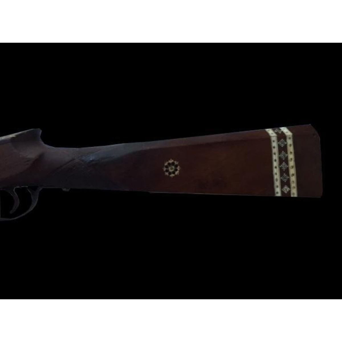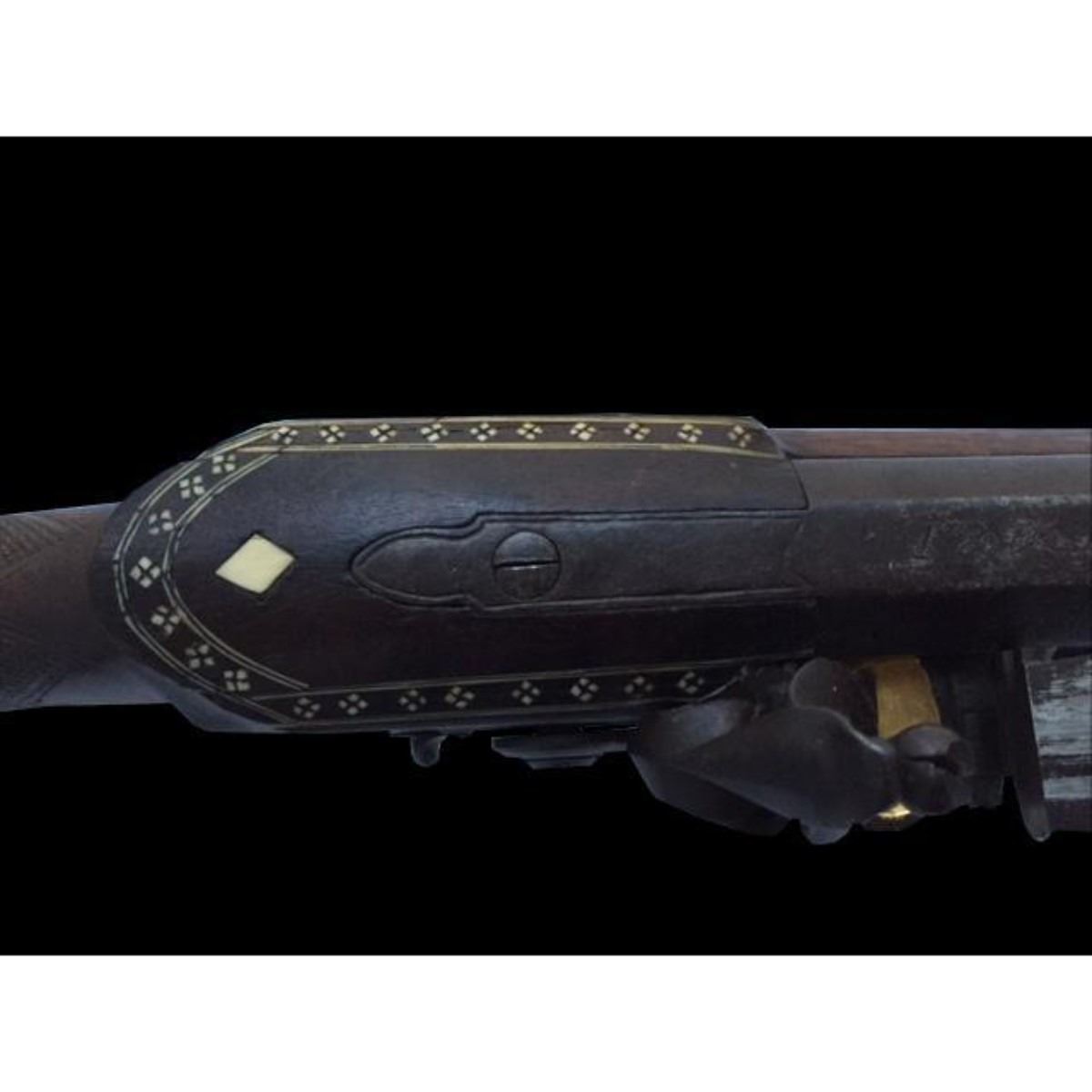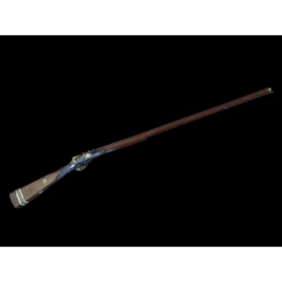 .700 Flintlock Rifle, c.1790 with 41" full stocked part round barrel/ octagonal at the breach, engraved to the top flat "Kohloi Lothe Preusische Garde Corps". Steel ramrod & sling swivels. Steel lock with gold pan &engraved with the name "Moore". Checkered grip. Intricate shell & bone rosettes on the walnut stock & bands around butt. 56" length overall.