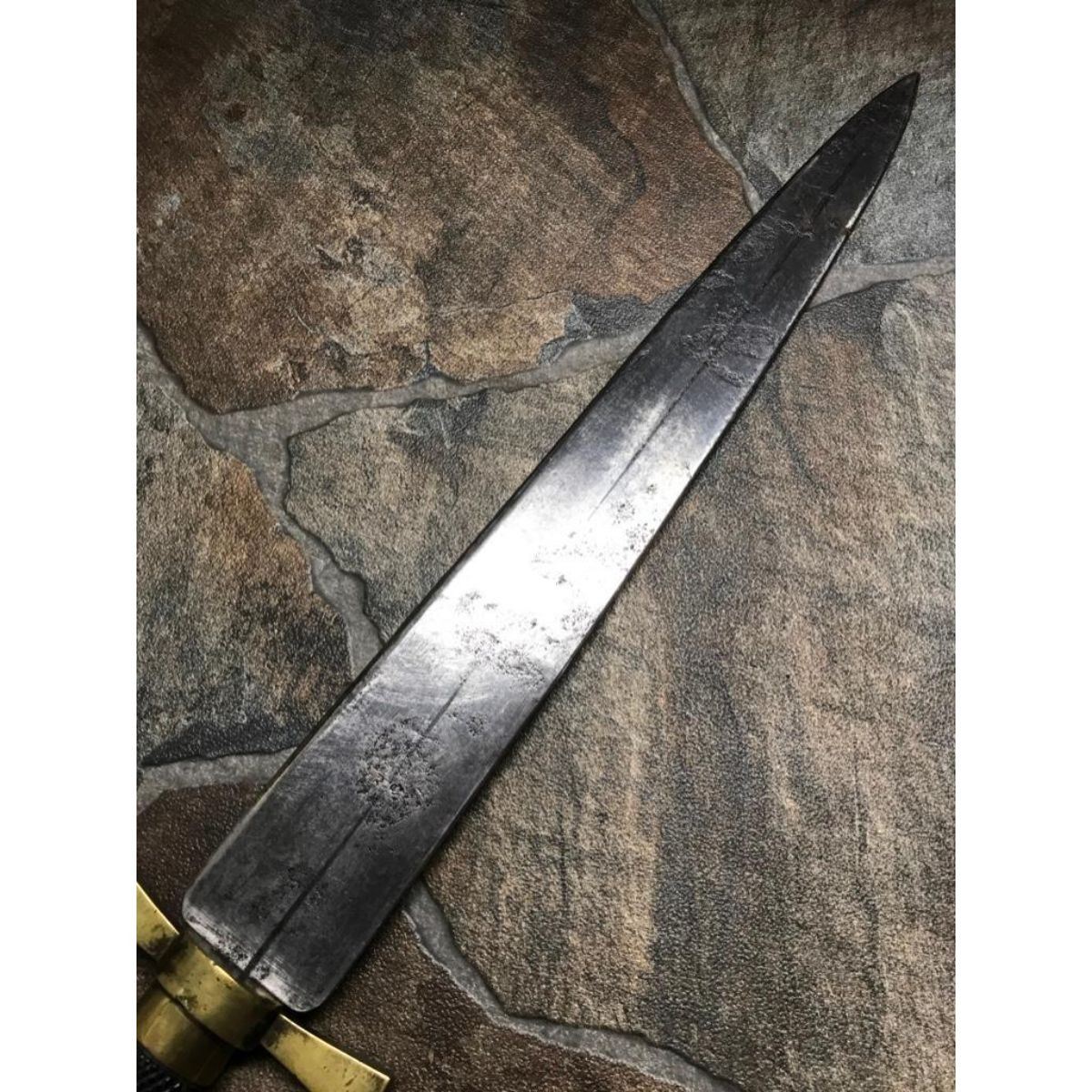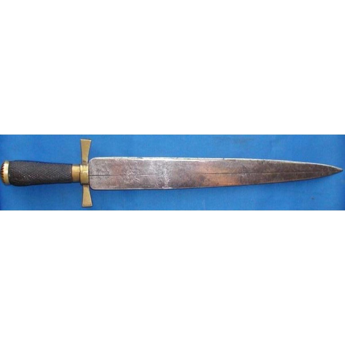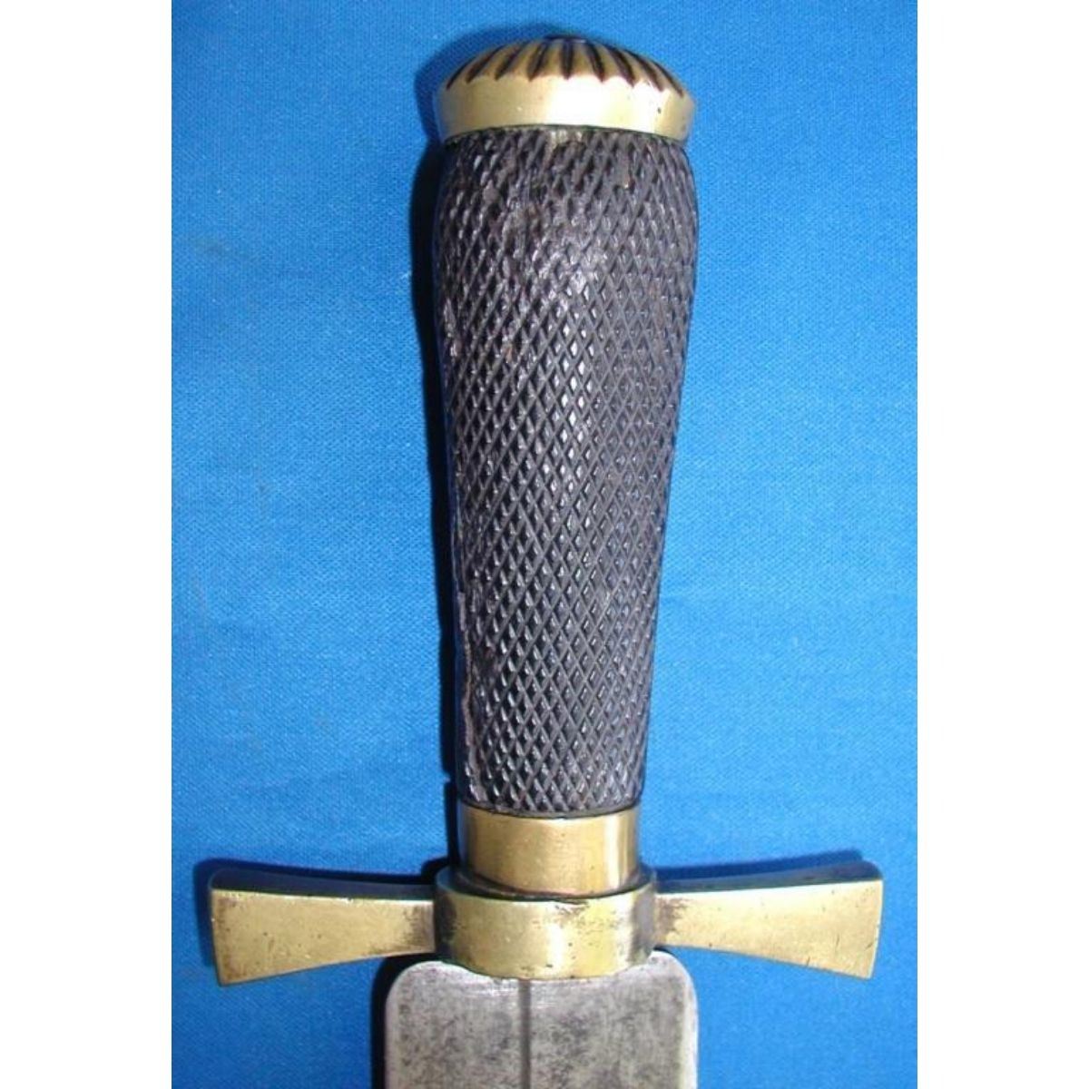 c1790 from Saxony in Germany. Short, double edged, very broad blade, 2" across & 15 1/4" length. Simple brass cross guard, checkered ebony grip & fluted brass pommel. Brass hilt in good shape. The grip has two minor cracks. The blade is rough, having some patches of heavier pitting. Shallow single fuller is tight & straight. 20 3/4" overall length.
