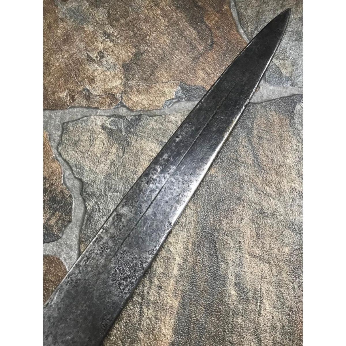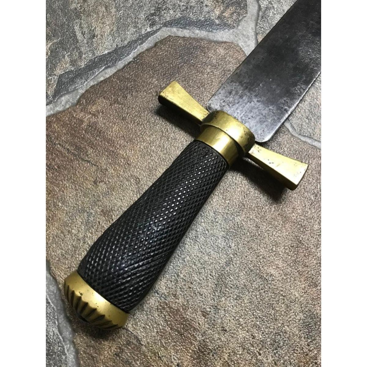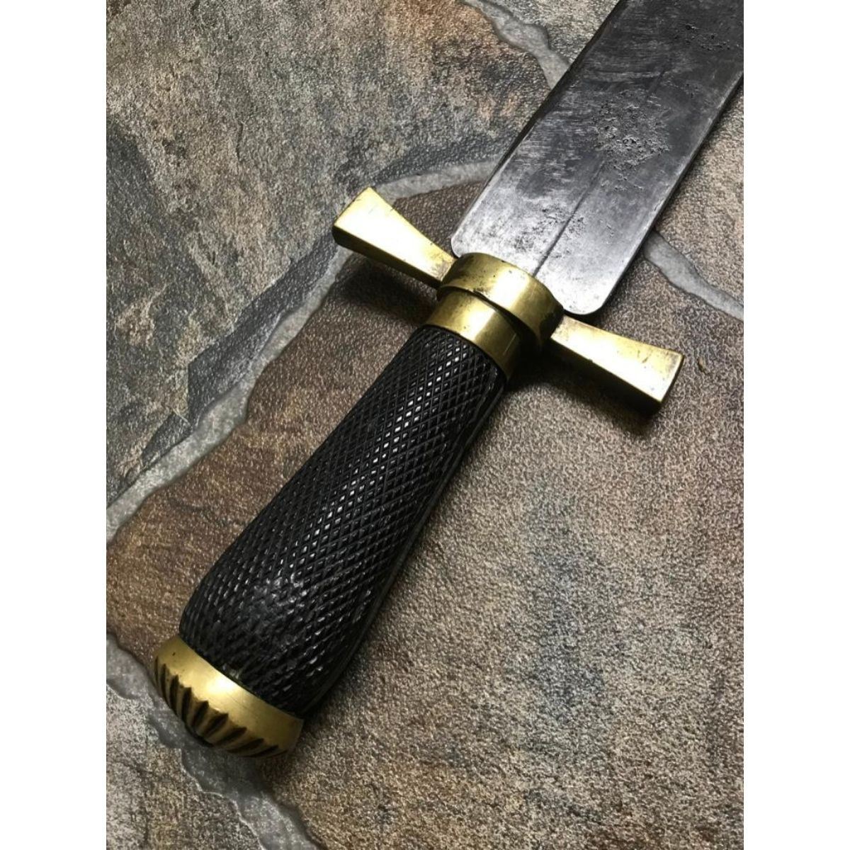 c1790 from Saxony in Germany. Short, double edged, very broad blade, 2" across & 15 1/4" length. Simple brass cross guard, checkered ebony grip & fluted brass pommel. Brass hilt in good shape. The grip has two minor cracks. The blade is rough, having some patches of heavier pitting. Shallow single fuller is tight & straight. 20 3/4" overall length.