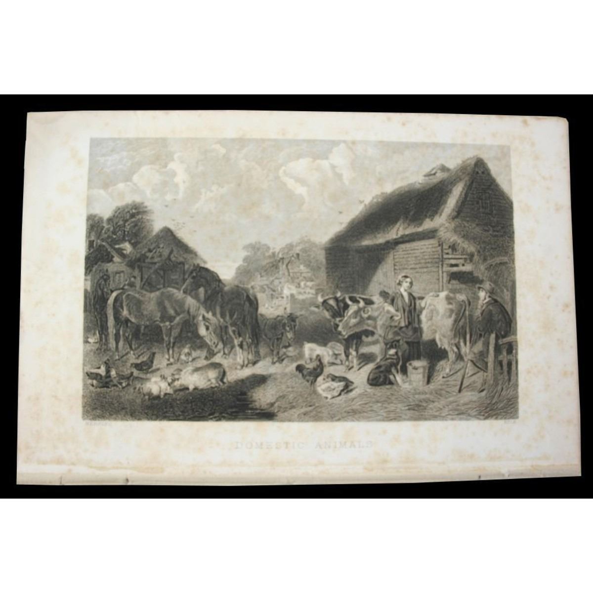 c1850 steel engraving entitled "Domestic Animals". Depicts a rural barnyard scene, a farmer & his wife with cows, horses, pigs, chickens, roosters & a faithful dog, alongside a thatched roof barn. Engraved byHerring. Book plate. Approx 5 1/4" X 7 1/4".