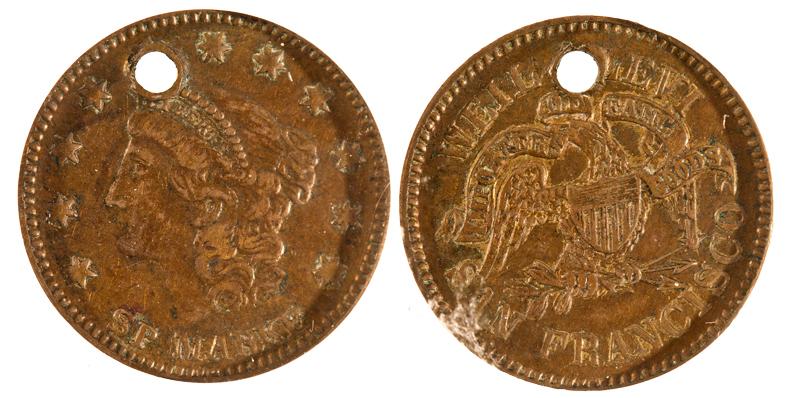 Weil and Levy - In NCS holder as token genuine, good for 12 1/2c holed. Obverse extremely fine. S.P. Mabke under liberty head. Hole above liberty coronet fifth star. Reverse Weil and Levy hole through "L" in Levy. Extremely fine with underline high lites. Scroll: Importers of fancy goods San Francisco. Very Rare. One of the great gold rush rarities.