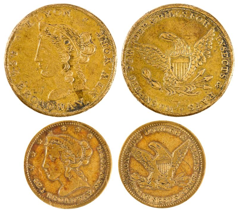 Lot of two store cards. 1) E. Lyon genuine NCS M-New York -New York Ruau 507. Obverse $5 liberty E. Lyon in coronet 424 Broadway New York, New York. Reverse magnetic powders and pills for insects and rats in legend around the eagle. Very fine. 2) E. Lyon. Uncertified $10. Same legends as $5 piece. Very Fine.