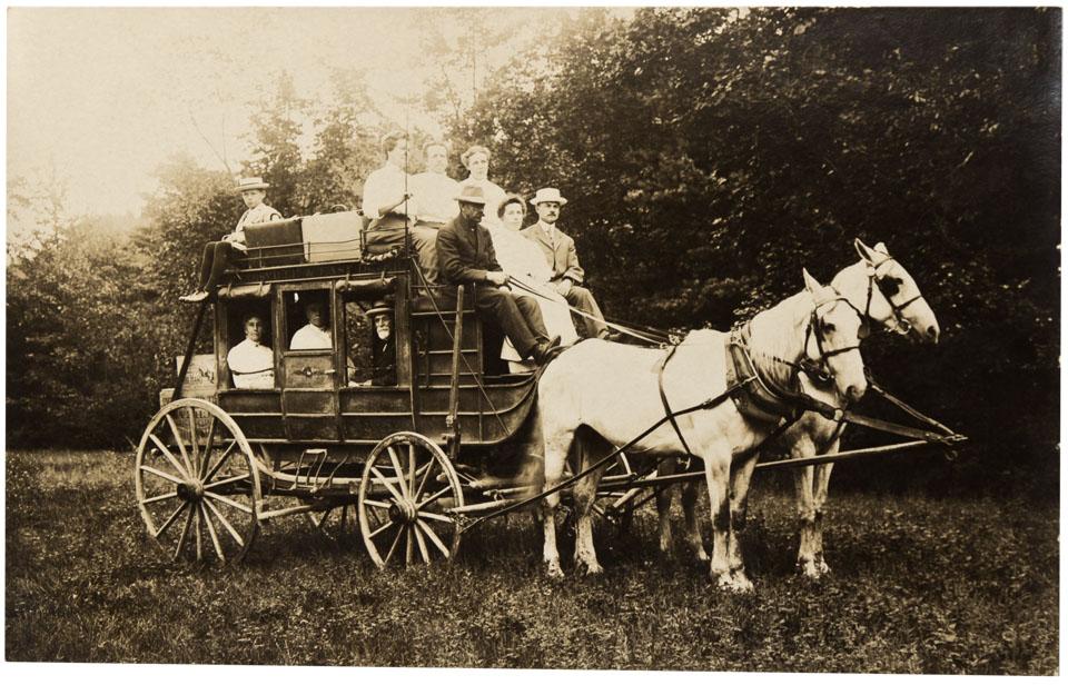 A photo of a stagecoach pulled by two horses. Three elderly men and women sit on the inside. Five at the top, and a young boy sitting at the end next to the luggage. It is surrounded by grass, bushes and tall trees. The stagecoach seems fairly old as the paint from the wood seems to be chipping off and the title is faded. Barely legible ". . .amvile & East Dover". The beginning is hard to see - the young boys legs dangle over the edge of the stagecoach and his shadow covers the heading. Two crates are stacked in the back perhaps, "Tiny Bee Hand"? And the other is upside down, "Cheap". Location is unknown. Unused, divided back, great condition.