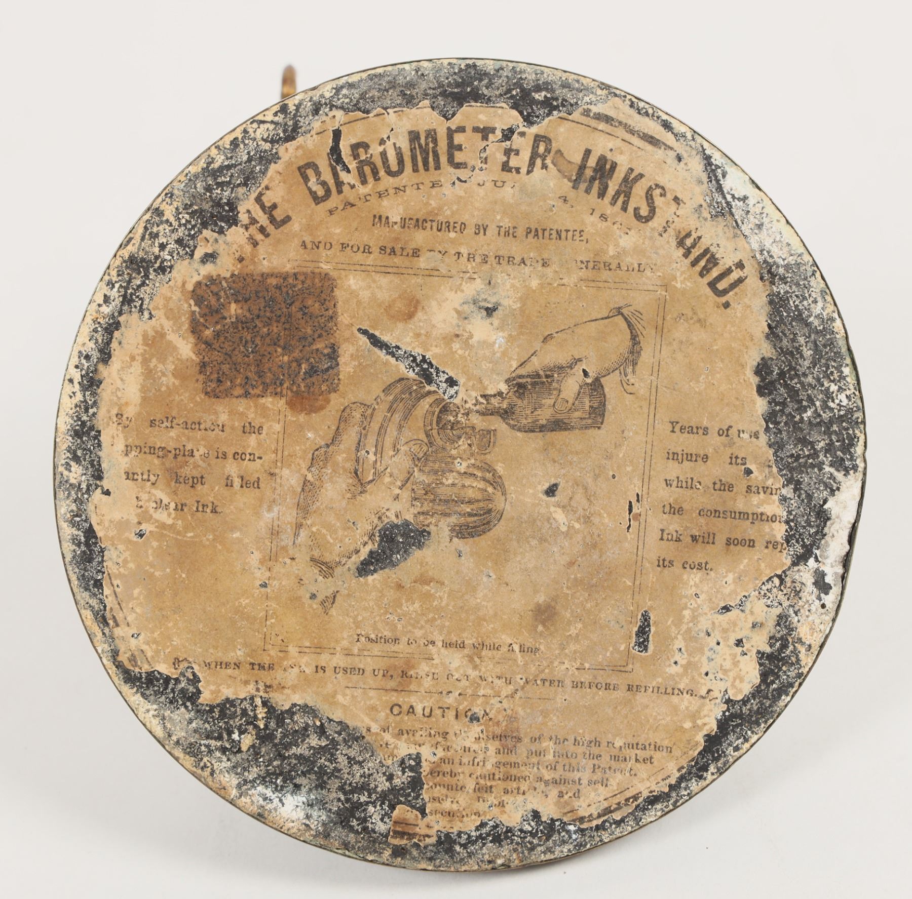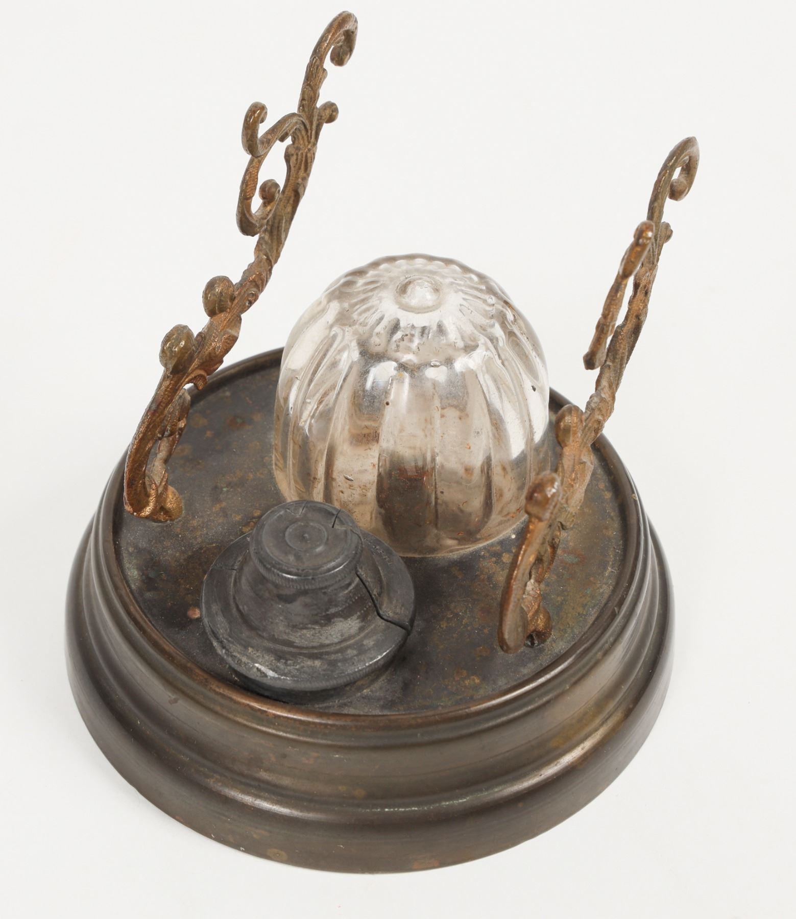 Ink stand with pen holder. Appears to be bronze. Inkwell has a flip-up top which moves fluidly without creaking. Base measures 5" across, 4" height including decorative pieces. Good condition. See photo.