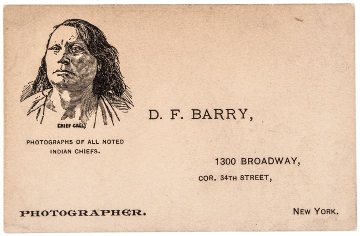 Original Printed Card measuring 3.25” x 2” for “D. F. Barry, 1300 Broadway, Cor. 34th Street, New York”. David F. Barry’s Photographer Business Card, with a wonderful illustrated “CHIEF GALL” Portrait at upper left, with text below image that reads, "PHOTOGRAPHS OF ALL NOTED INDIAN CHIEFS." Card lists a New York City address. David Frances Barry (1854-1934) was a photographer based in Bismarck, Dakota Territory, who is most noted for his photographs of famous American Indians. In 1878, he was hired by itinerant photographer O. S. Goff, with whom he eventually partnered. From 1878 to 1883, Barry traversed the Dakota Territory, making many of his most widely known photographs of American Indians, forts and battlefields, military officers, and other people in the region. In 1883, Barry opened a new studio in Bismarck, where he began photographing members of Cody's Wild West Show. This current business card is the first we have seen and offered. Certainly an important acquisition for any collector of David F. Barry photographs. For additional information see: http://www.gresl.com/compositions/barry.html Extremely rare and excellent for display.