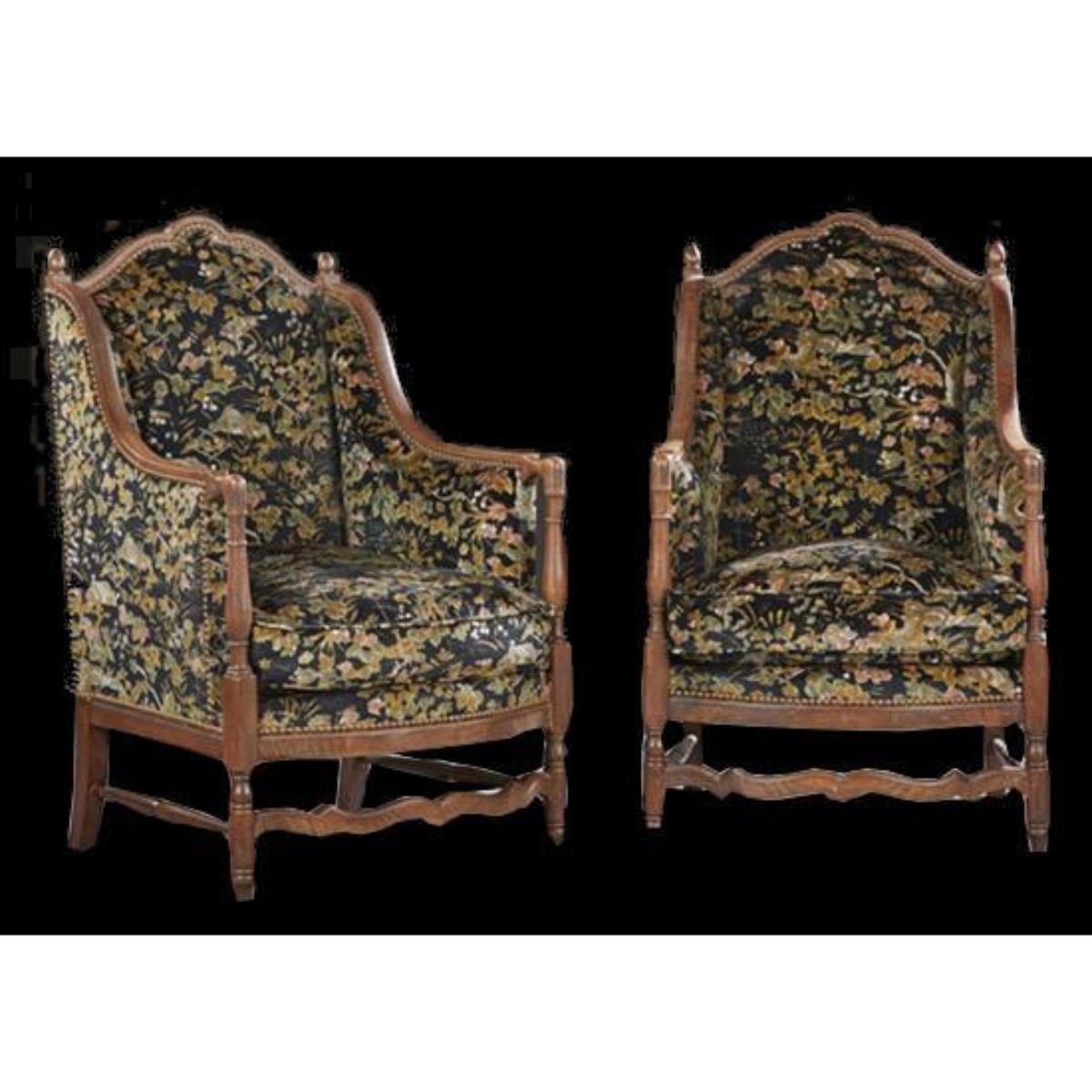 Pair of Upholstered Walnut Diminutive Wing Armchairs, c. 1880, the serpentine arched crest rail flanked by finials above a bowed cushion seat, on block & turned legs, joined by serpentine stretchers, in black floral velvet upholstery with iron tack decoration, 39"H X 24"W X 21"D. 9937-032418-IN-00031