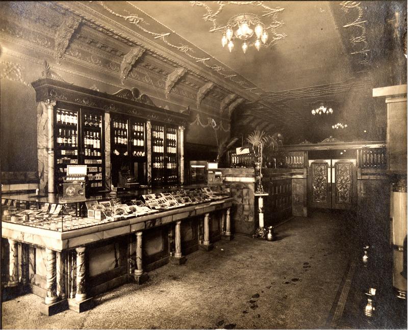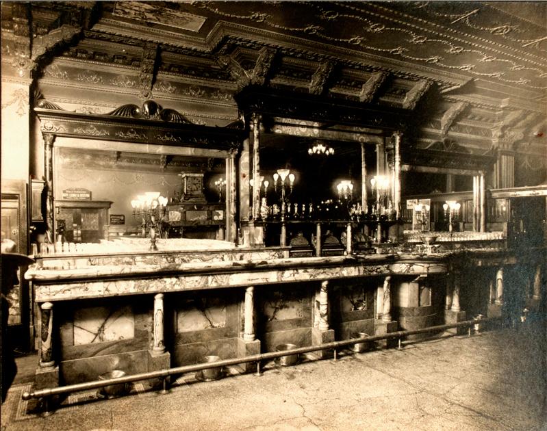 Lot of 2 matted interior photographs. 1) Opulent saloon interior with a fancy bary with cut marble stone pillars and front. This must have had a large, upscale clientele; dozens of glasses are ready. A sign reflected in the bar mirror "Oysters & Shell Fish" and the name "Sezton"? Another sign says "Merchants Lunch". The profile of a man is at the far left, partially visible. 7 1/2" X 9 1/2" mounted on 11" X 14" cardstock. Nice clear image with good contrast. 2) Cigar store interior shot with two card machines visible on the counter. Also a fancy establishment with marbled pillar; obviously part of the same building since crown molding and ceiling panels are identical to the saloon shot. Several cigar brands are visible such as Harvard. Retail sale of 4 QT cigars. Same size, mounting and condition as saloon photo.