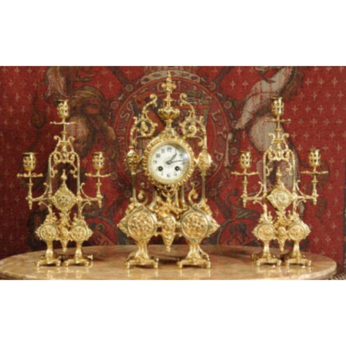 Japy Freres antique French gilt clock set. c.1890. Clock & 2 candelabra included. Dial is enamel on copper & is complete with original blue steel hands. The rear door is glazed to allow the movement to be seen. Runs for 8 days & strikes the hours & halves on a bell. Clock height 17 1/2", width 9 1/4", depth 5". Candelabra height 15", width 8 1/2", depth 4 1/4".